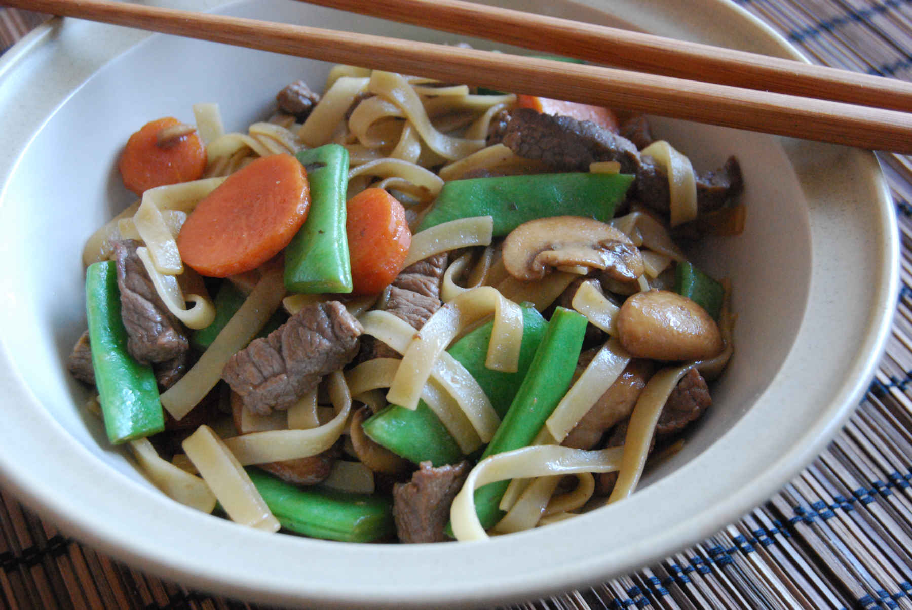 Meanwhile, cut your meat in thin stripes and fry the meat in a wok with a little bit of vegetable oil. When it is no longer pink, take it off of the wok and put it aside.