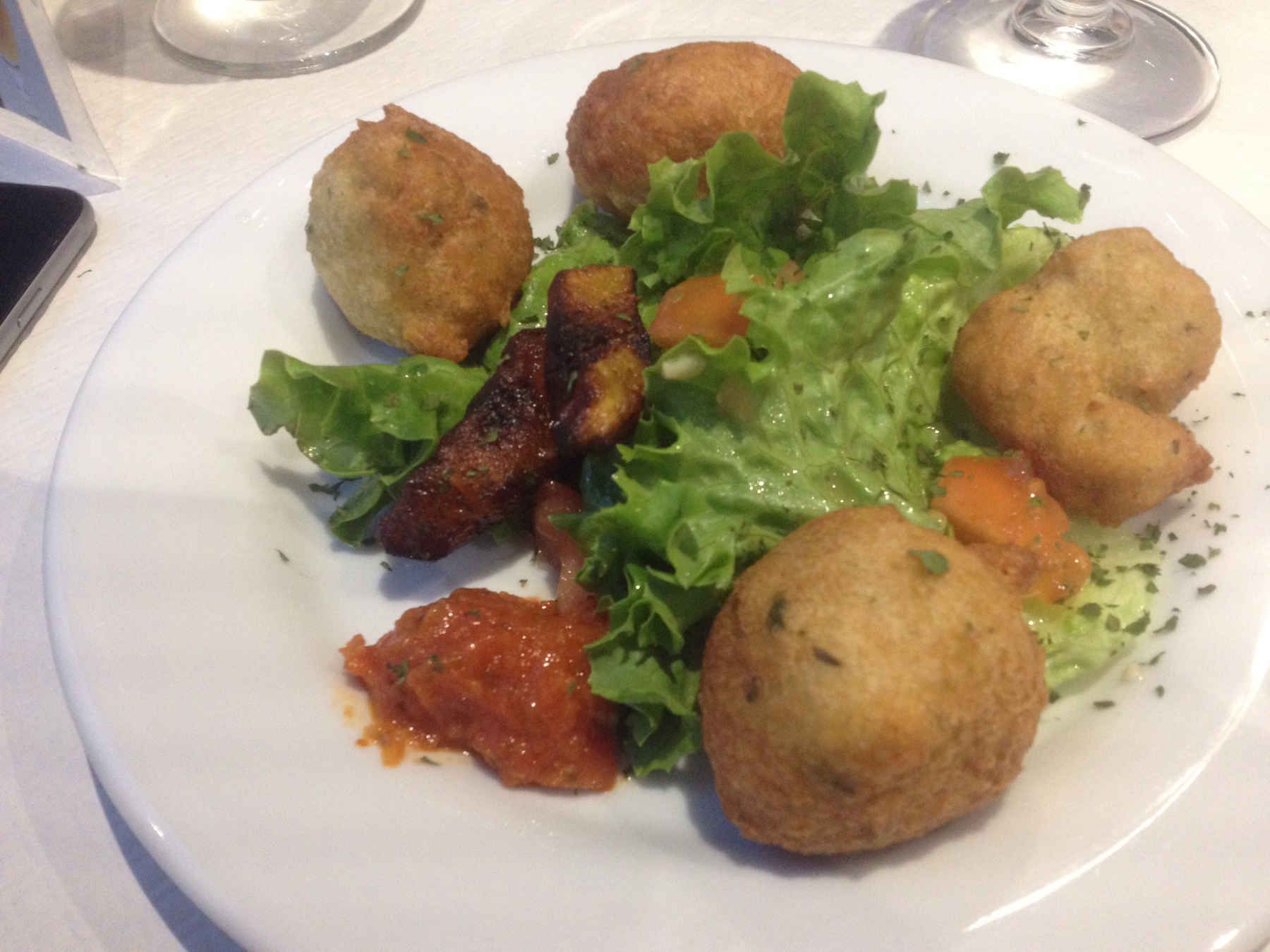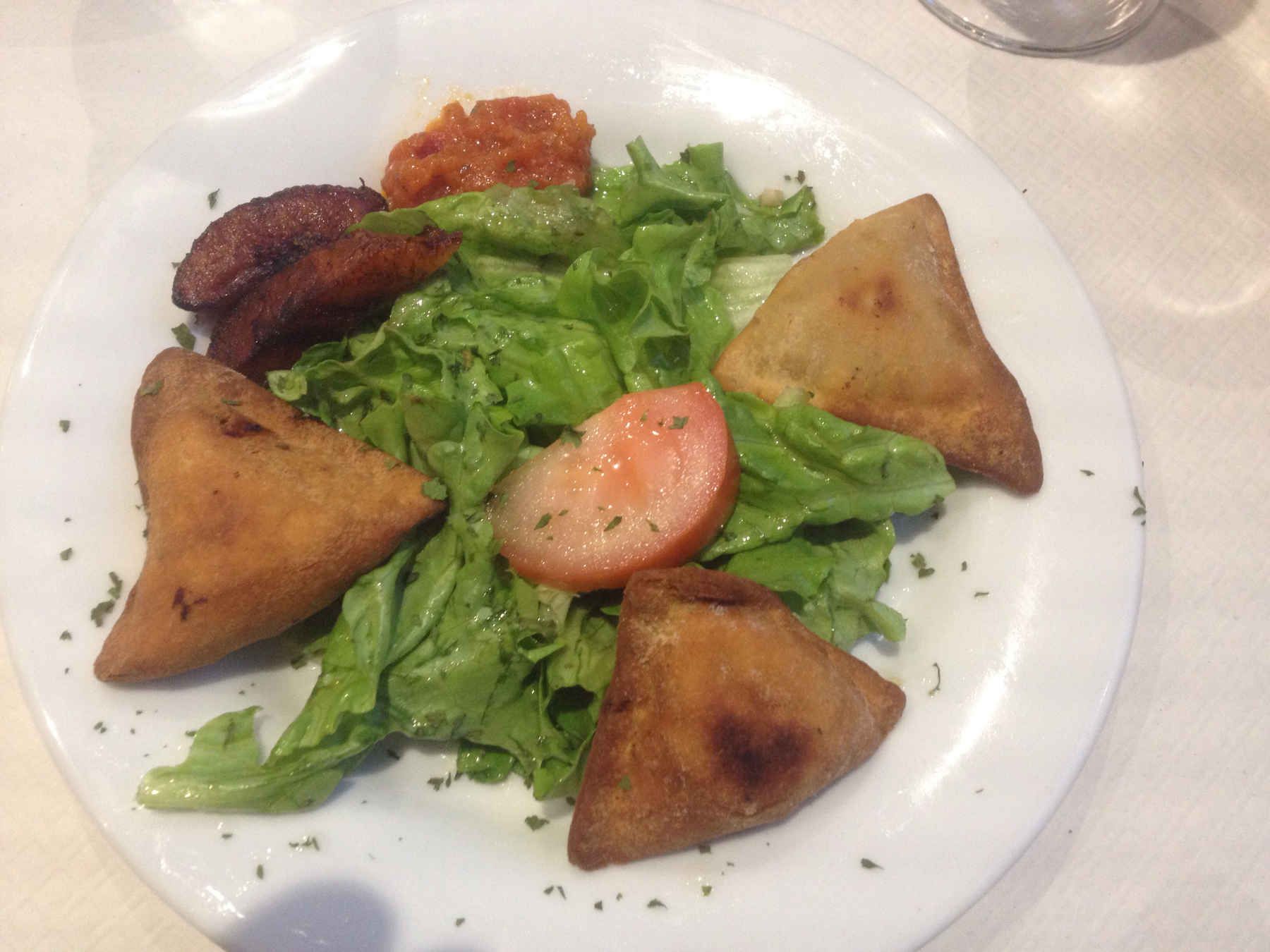 The waiter come to take our order. I ask for the plantain banana fries but he tells me that they don’t have it today. So I just ask for the beef samoussas. My husband went for cod fish cakes.