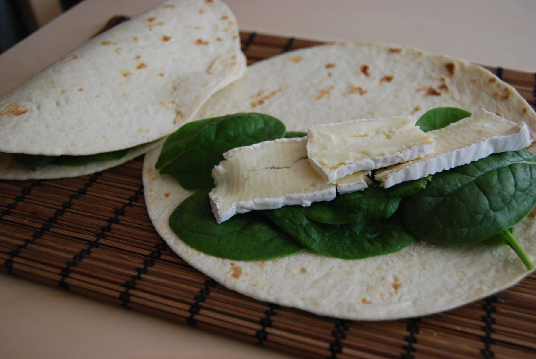 Take a tortilla, put a handful of spinach on one half of it. Add the cheese. Fold it in two, I used a toothpick to keep it in place while grilling because I went a little bit crazy on the spinach.