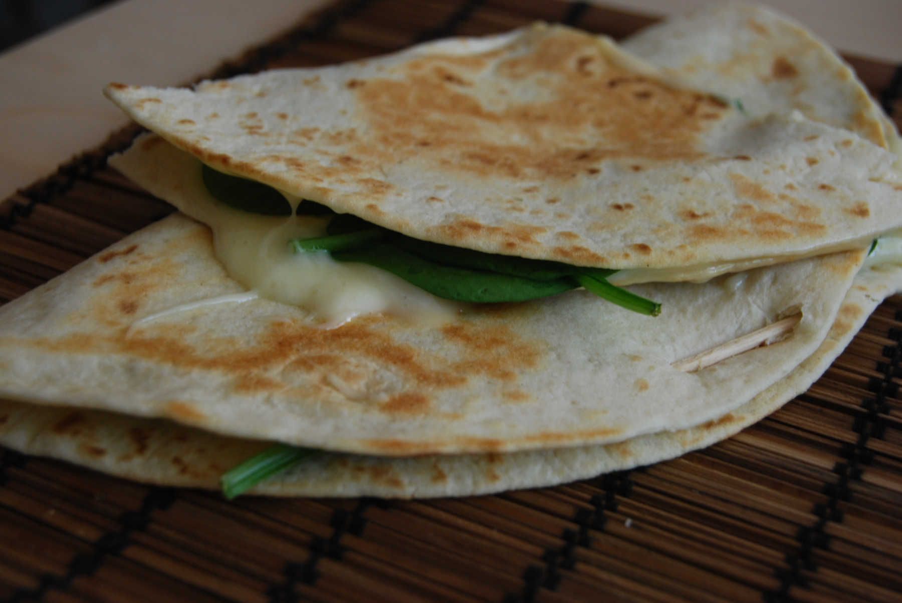 I love that the tortillas become a little bit crispy and the cheese melts and oozes out of here. And the spinach give a it a fresh taste.