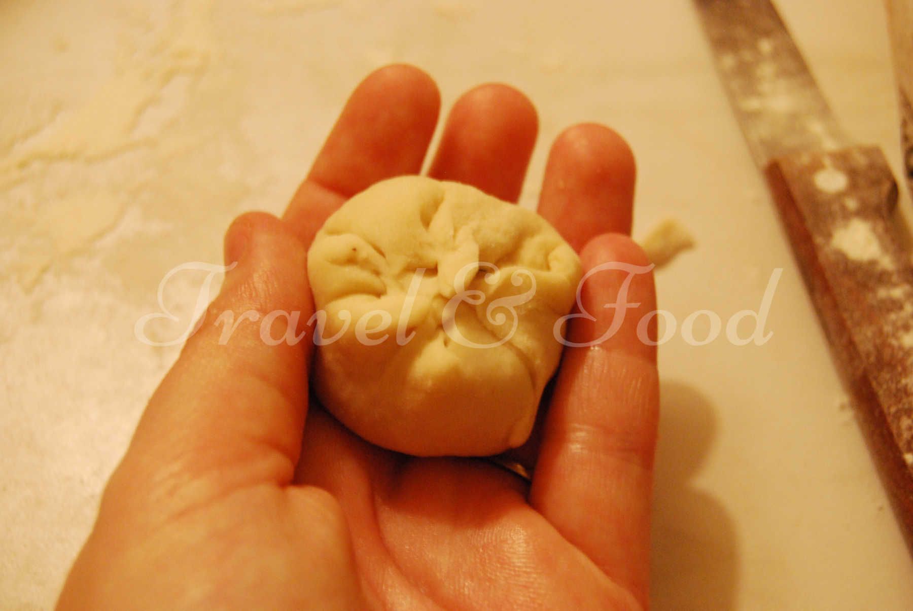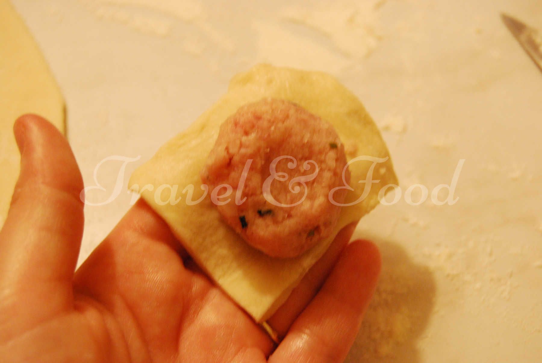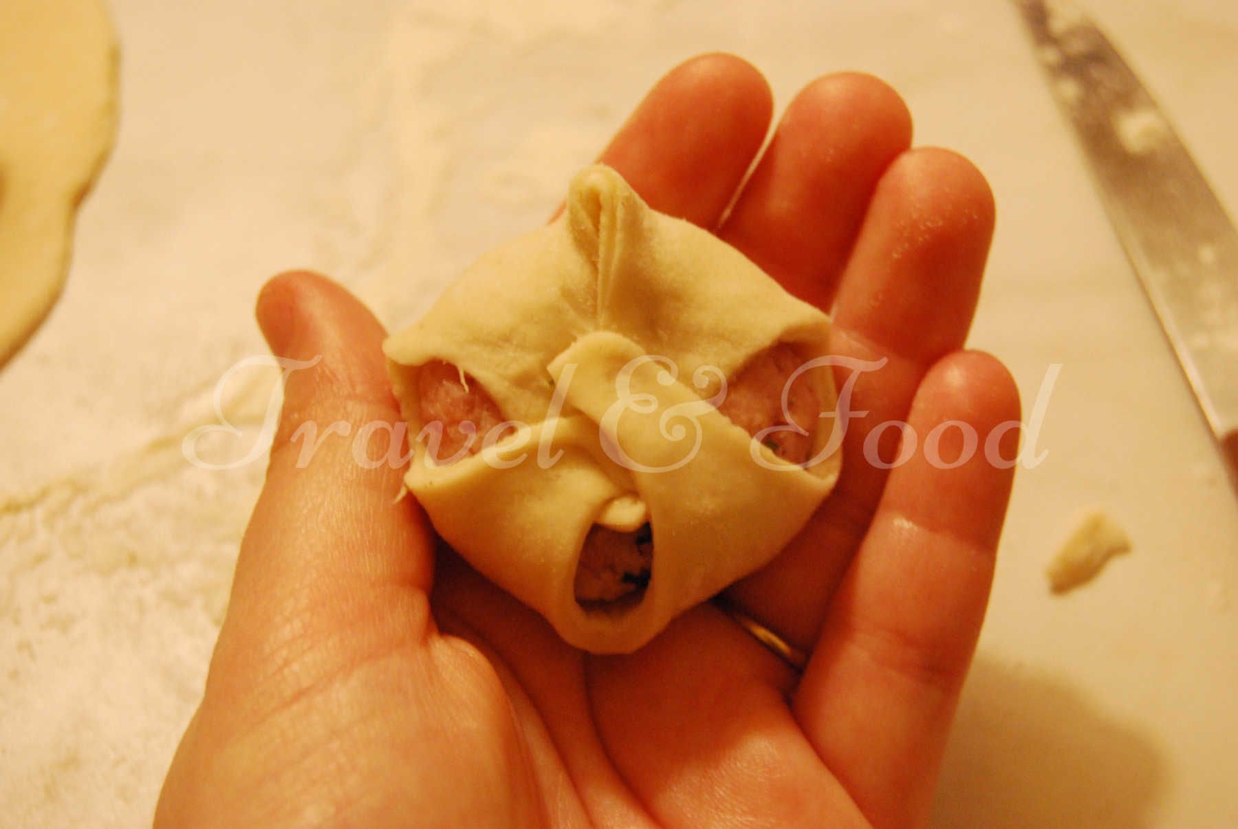Get a square shaped cookie cuter (8cmx8cm is good) and use it to cut squares into your dough. Put a little ball of stuffing in it and fold the dough like so :