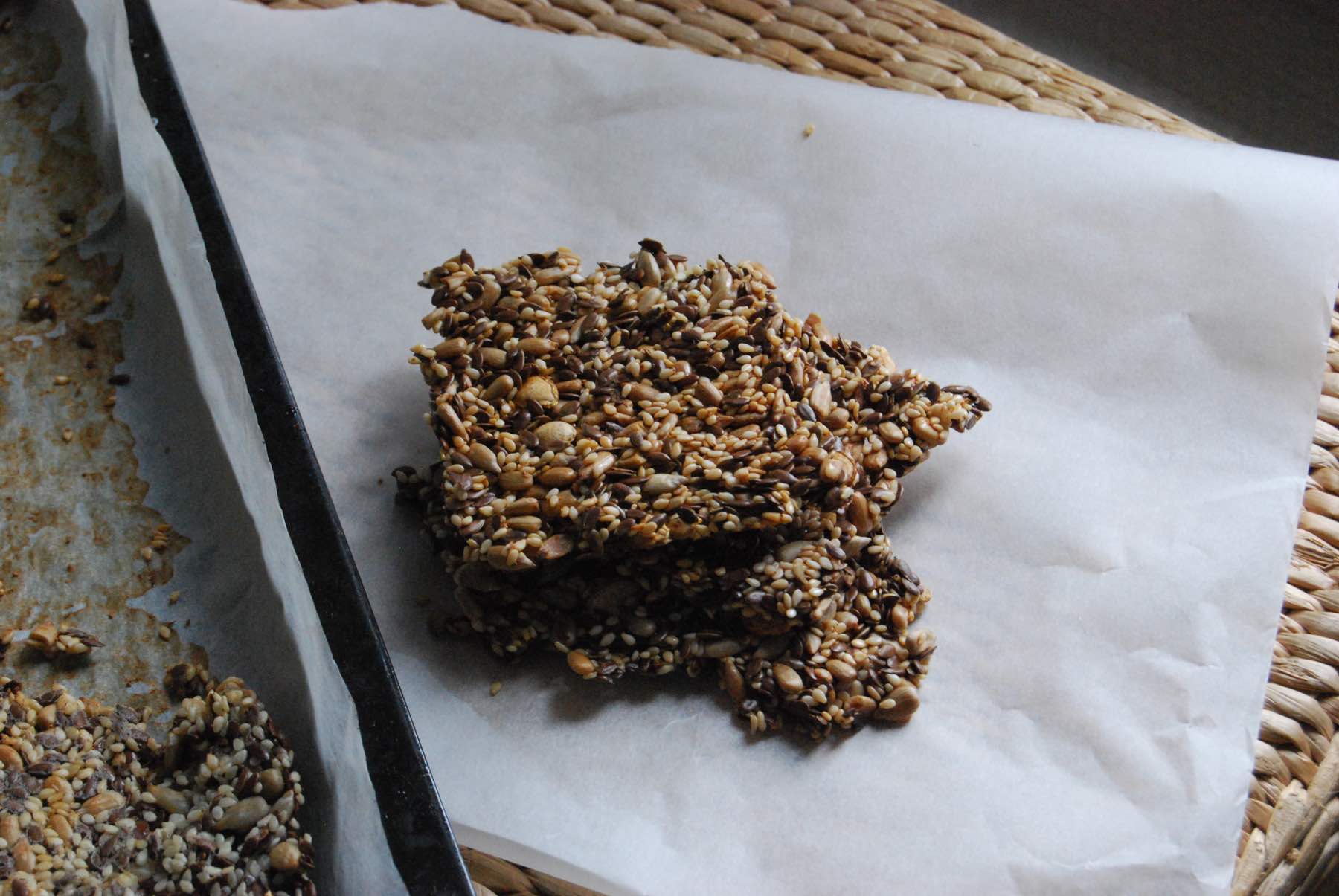 Line a baking sheet with parchment paper, spread the mixture to 1 or 2 cm thick. With a table knife, cut the crackers shape you would like.