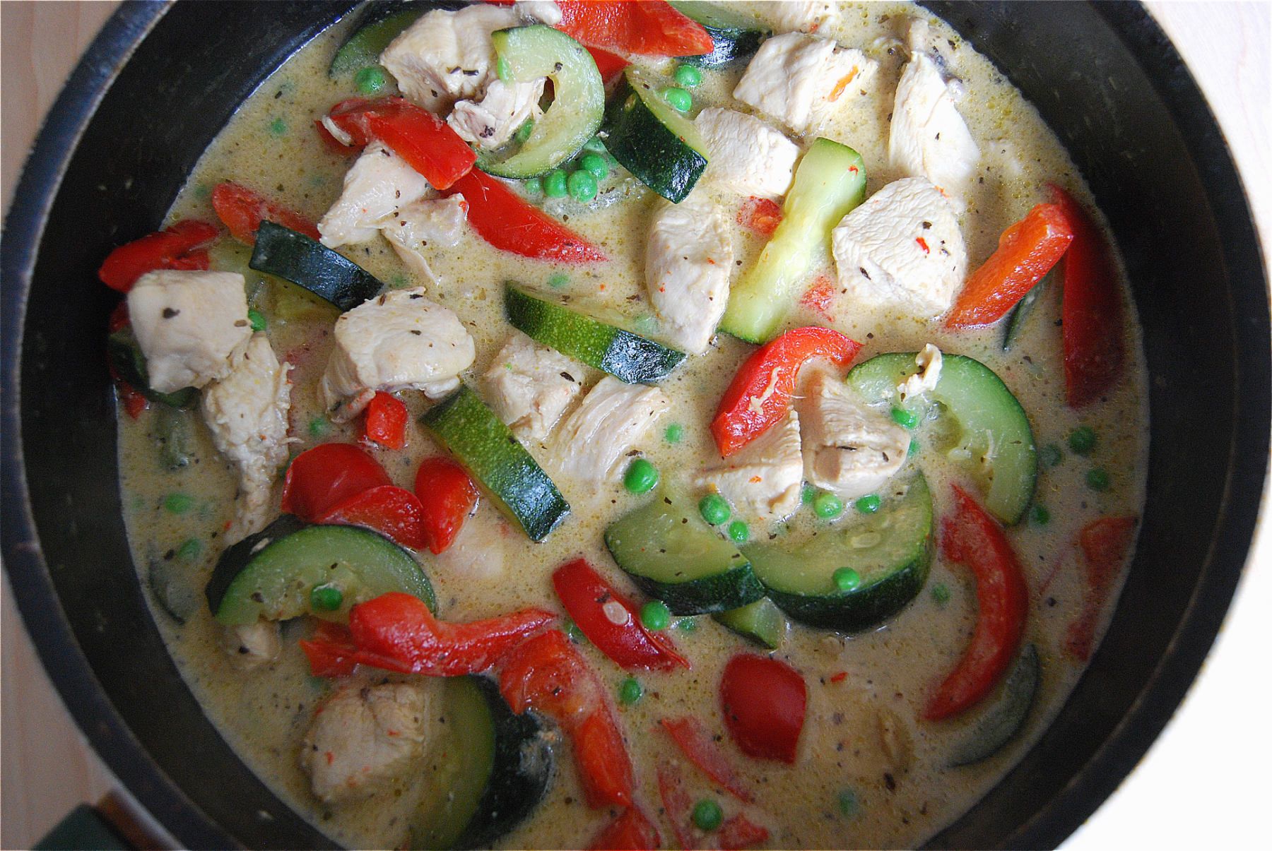 In a large pan, fry the chicken in a glug of vegetable oil. When brown, add the green curry paste, mix and let cook a few minutes.