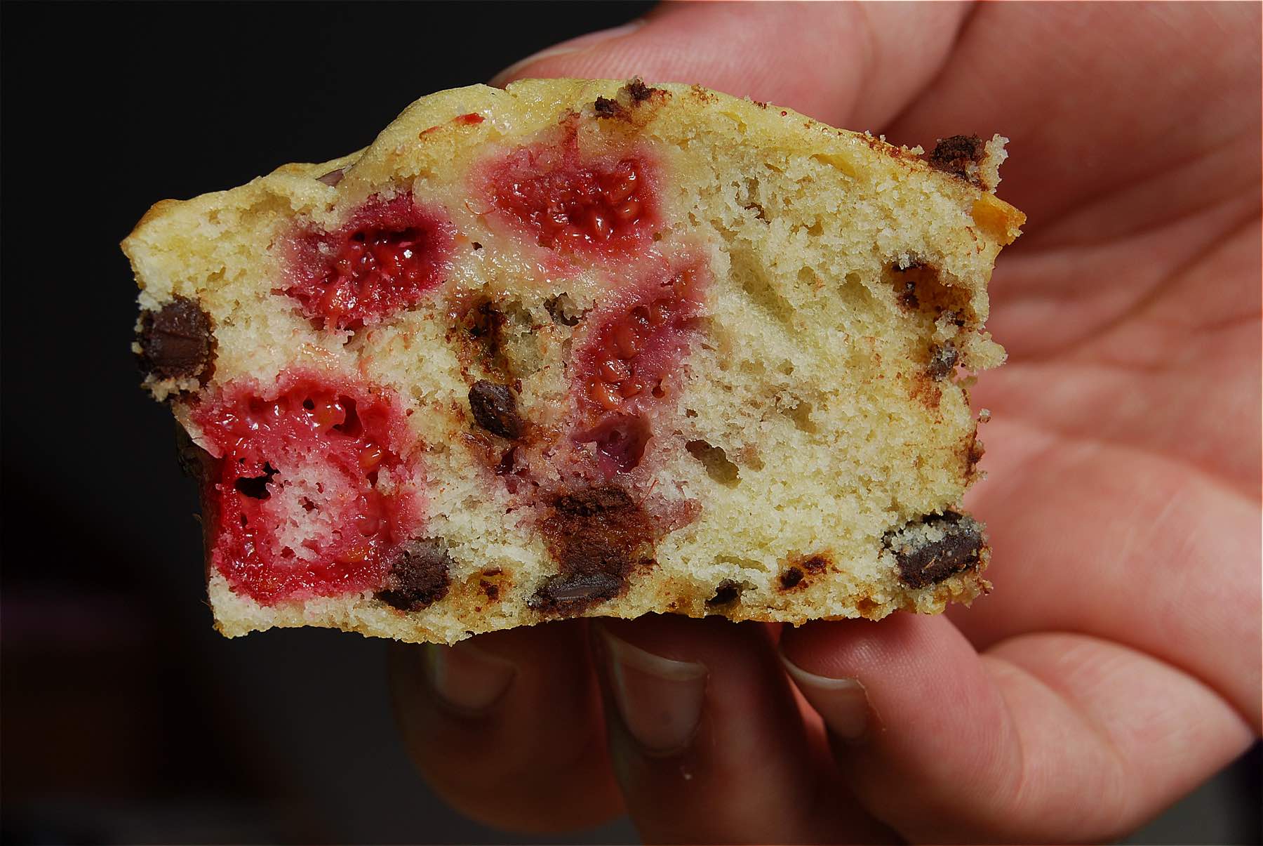 In an other bowl, add the flour, sugar and yeast, mix. Then add the liquid ingredients. Mix well and add the raspberries and chocolate chips.