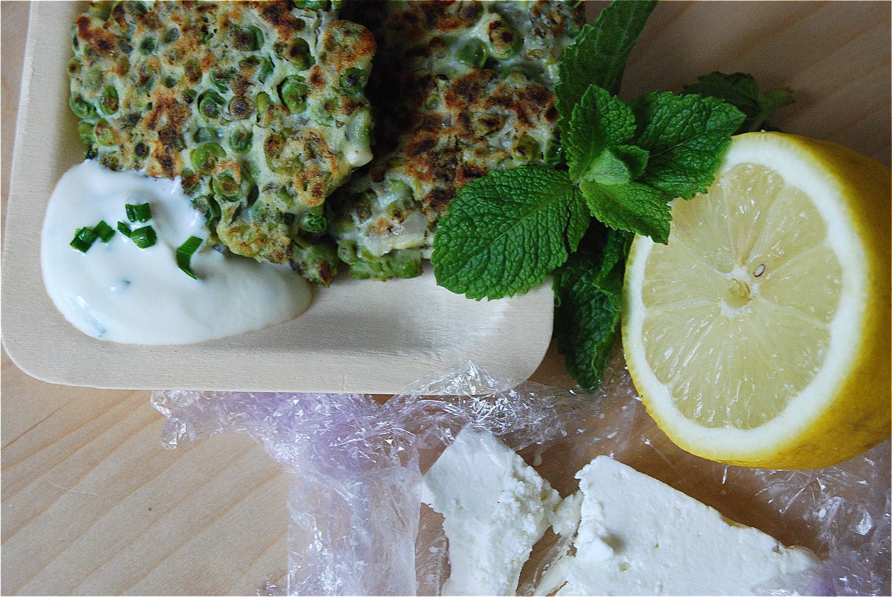 In a bowl, mix the eggs, flour, mint (finely chopped), crumbled feta cheese and season. Add peas, mix.
