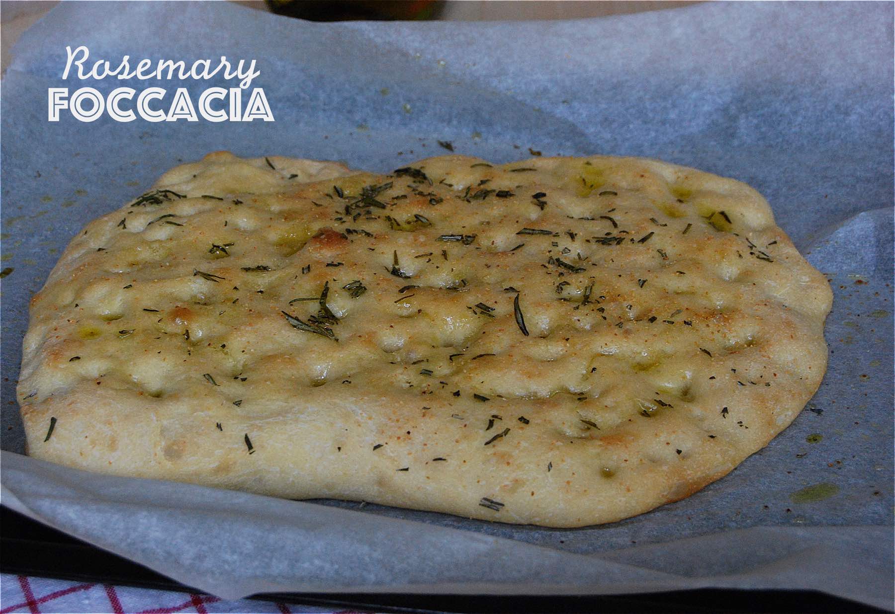 Punch the dough. Transfer on a baking sheet covered with parchment paper. Flatten the dough with your finger until you get the shape and thickness you like. Add a good drizzle of olive oil on it, add finely chopped rosemary and garlic powder.