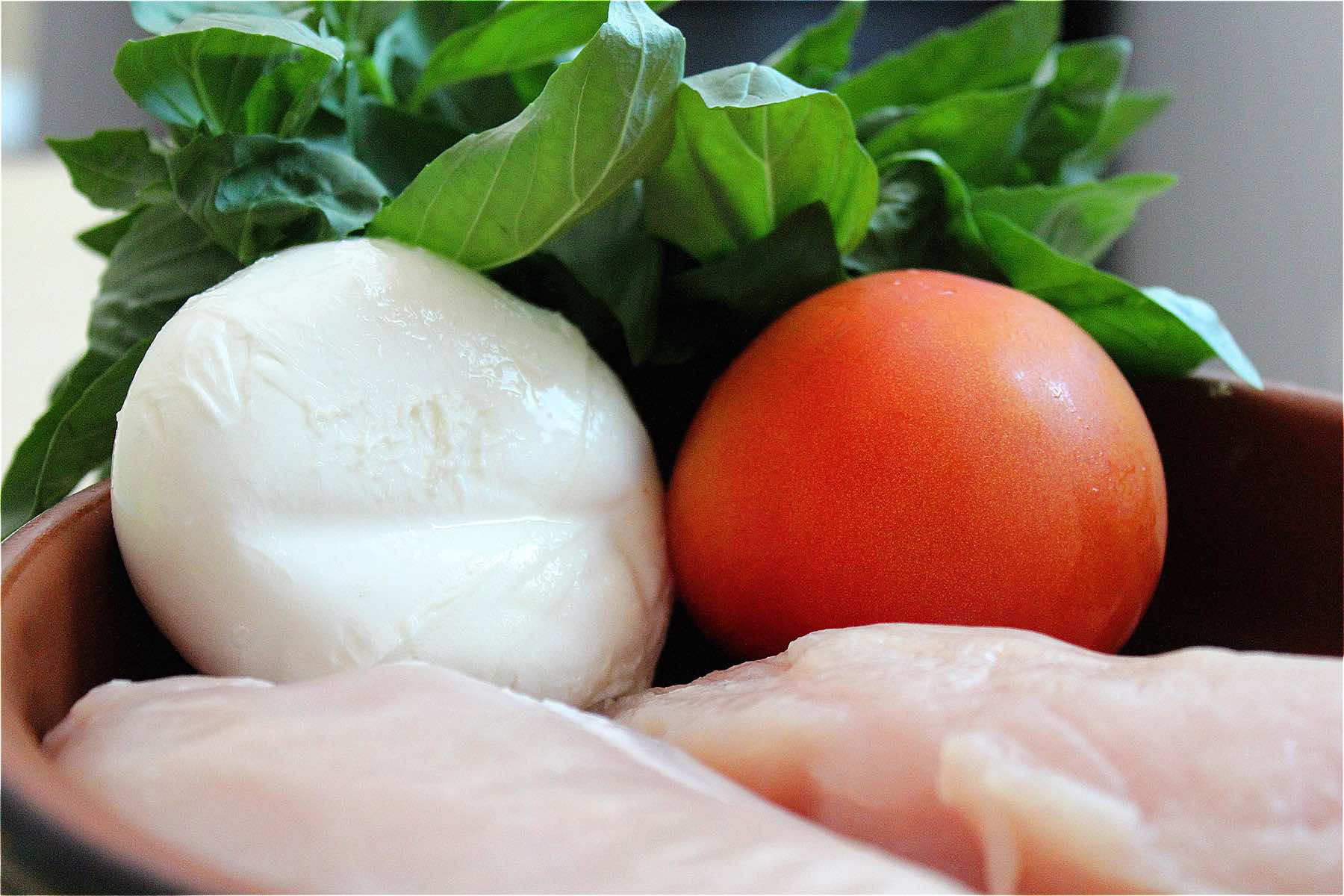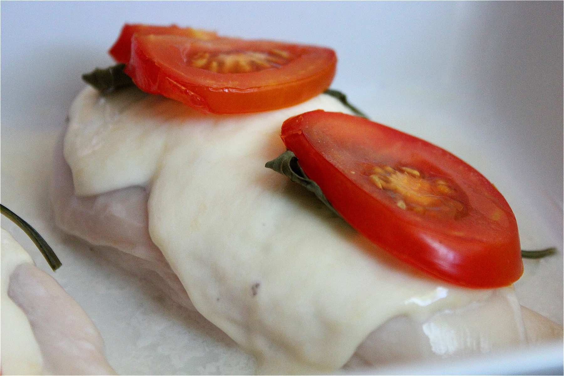 In an oven safe dish, lay your chicken, top it with mozzarella, basil, tomato and drizzle with some olive oil. Salt and pepper it.