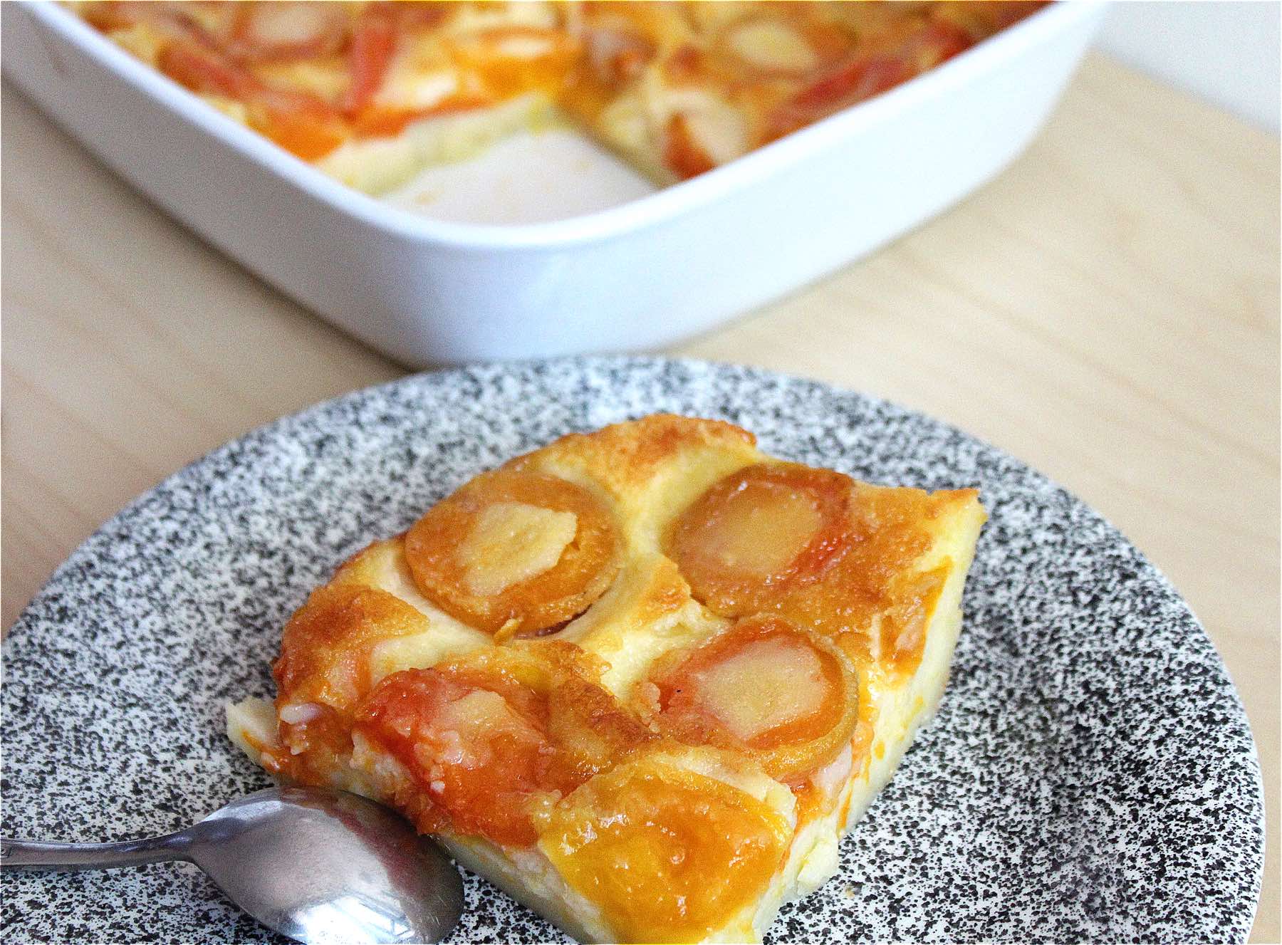Grease your pan and put the apricots at the bottom. Pour the batter over and bake for 30 minutes and end it with 10 minutes on the grill position of your oven so it’ll get golden.