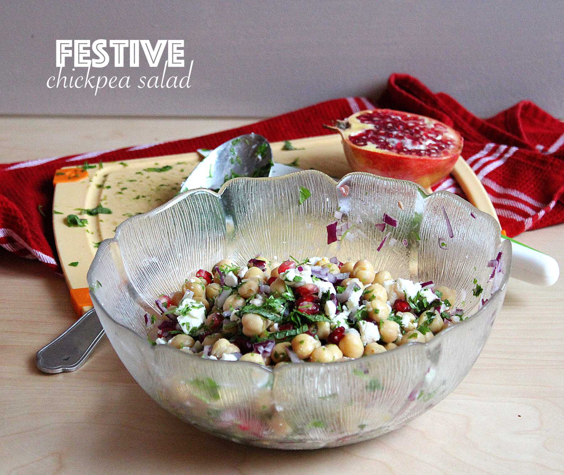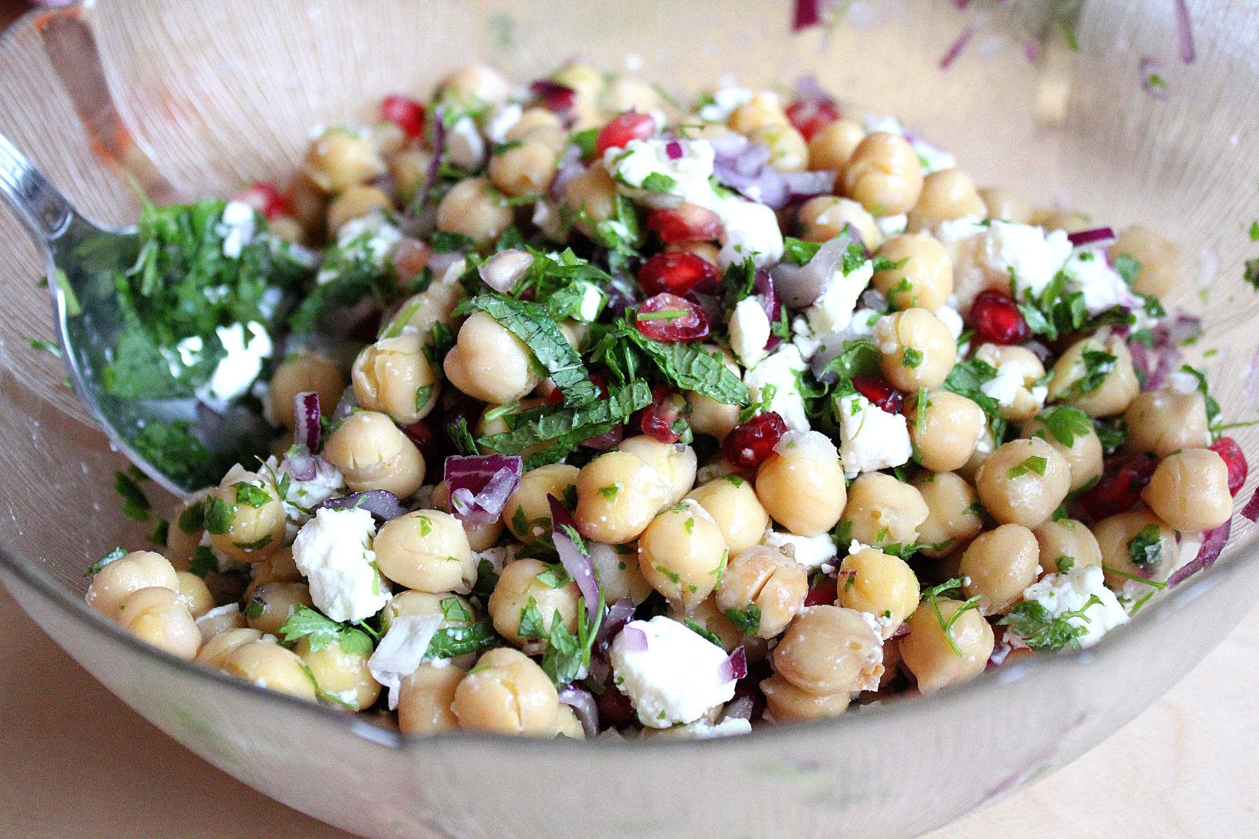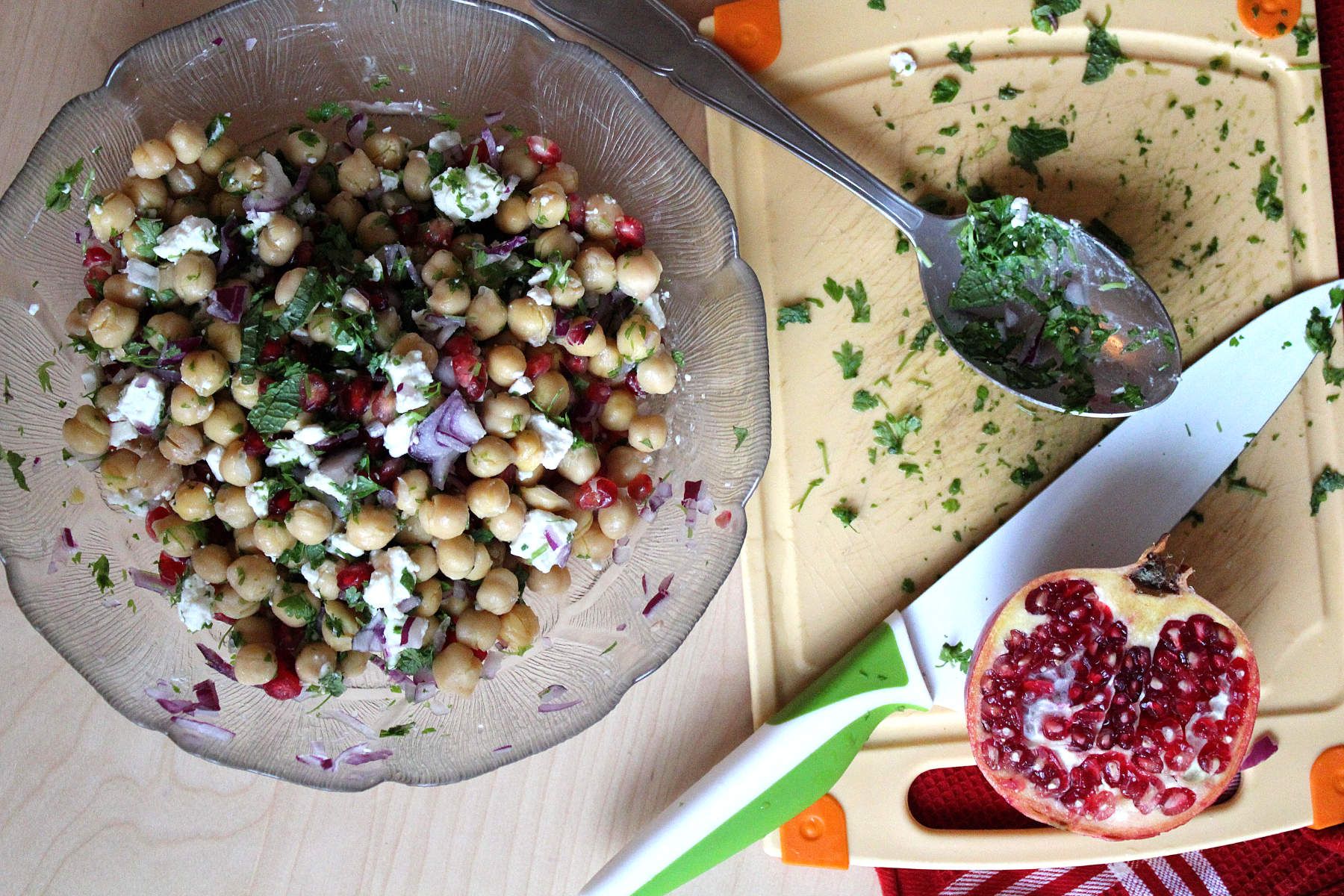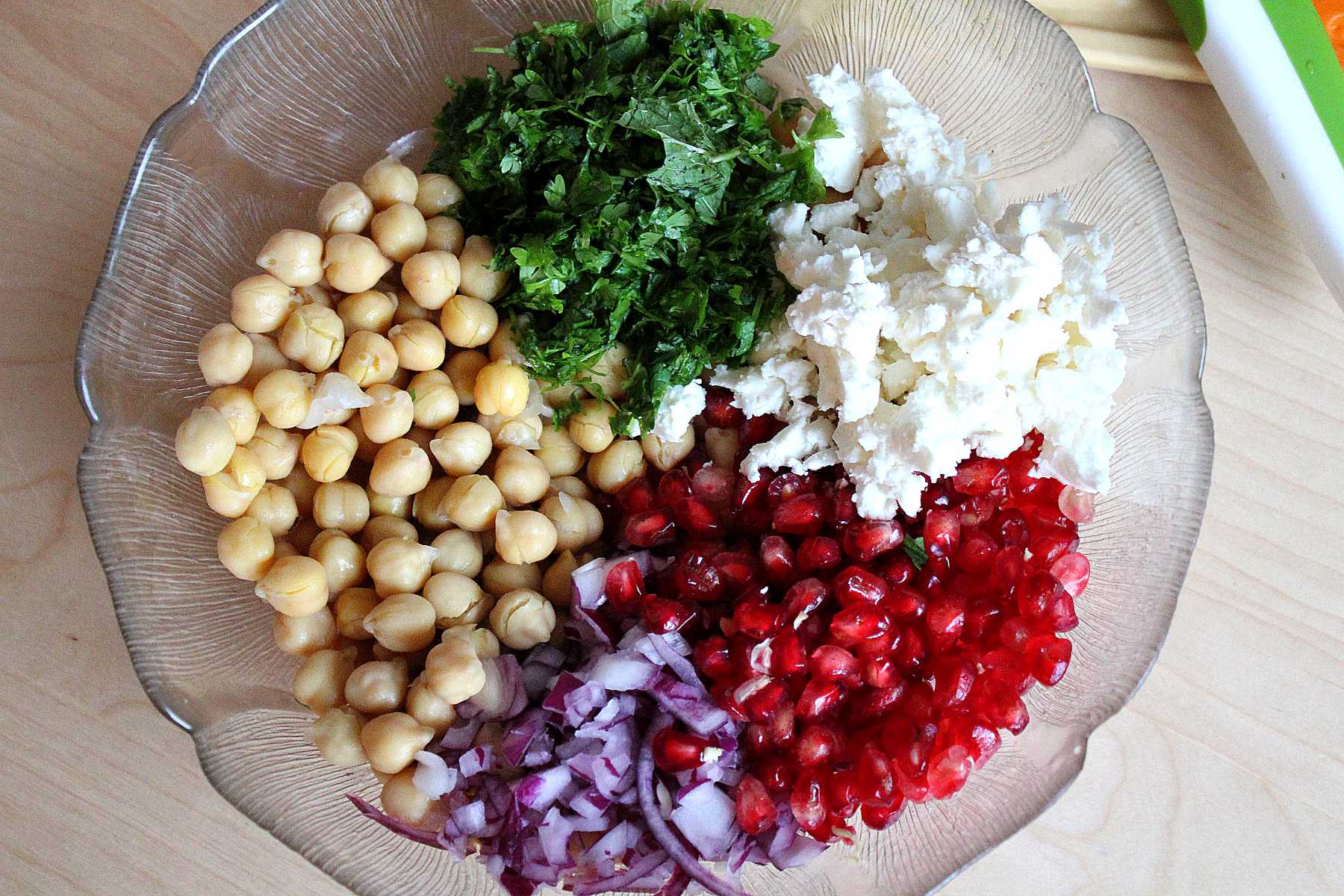 Chop your onion and herbs finely. Add in a large bowl the rinsed chickpeas, onion, herbs, crumbled feta cheese and pomegranate seeds. Mix.