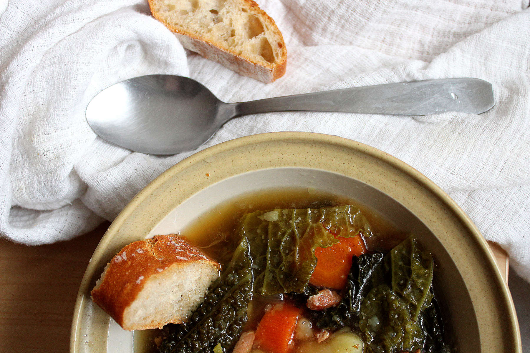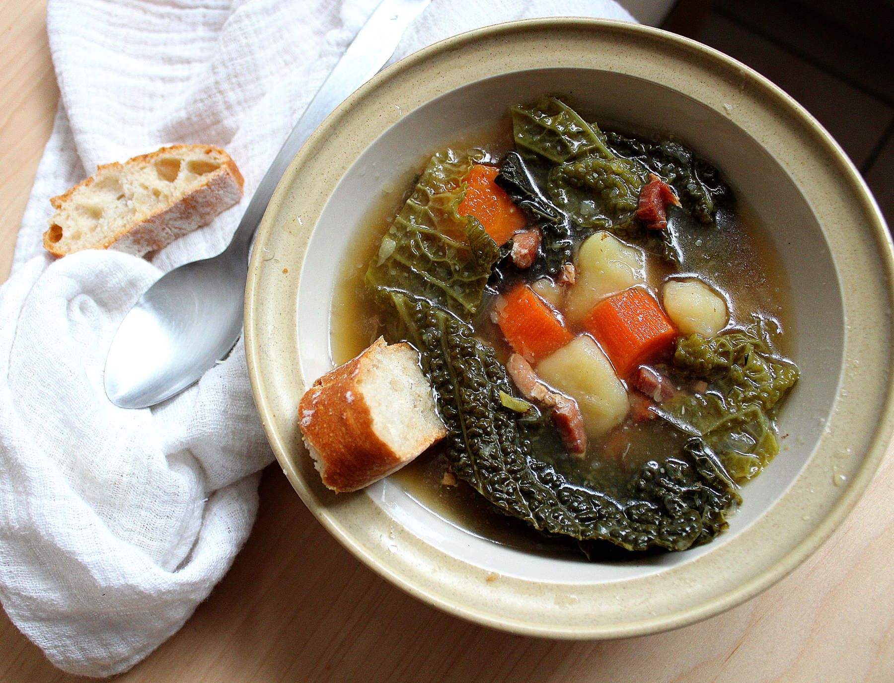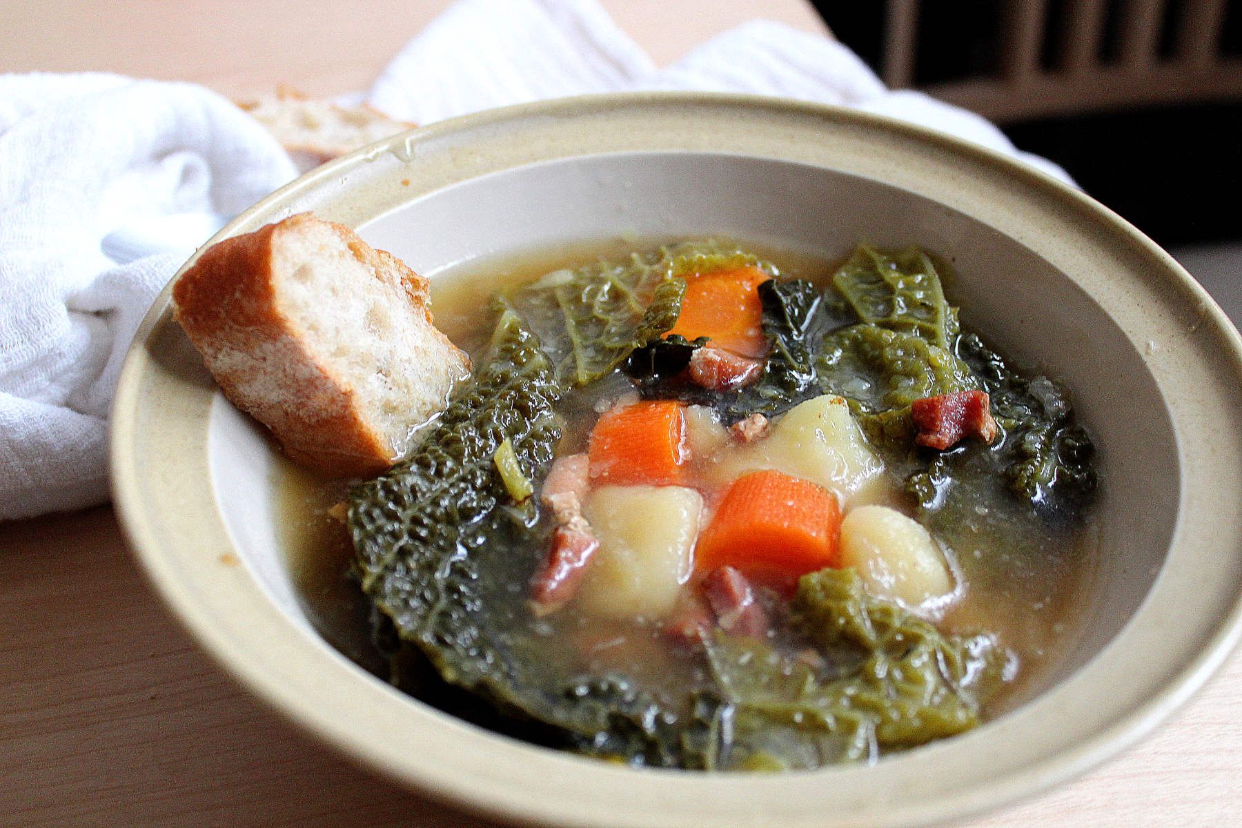 This recipe is a cheap one : cabbage, carrots, potatoes, bacon are cheap produces at that time of the year. My 18 months old loved this soup (even the cabbage!).
