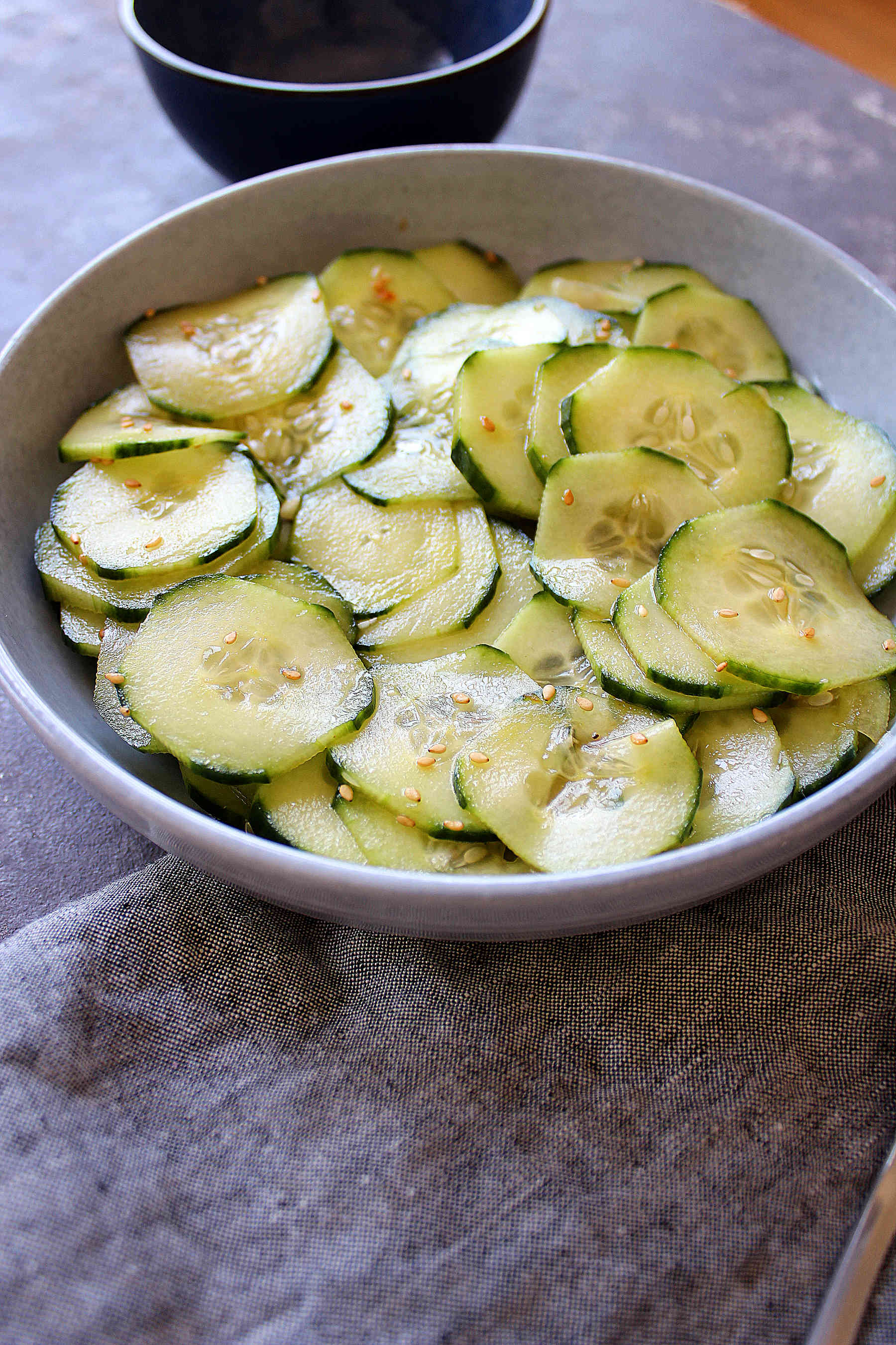 Add cucumber in a serving bowl, pour sauce over and mix well. Decorate with a few more sesame seeds.