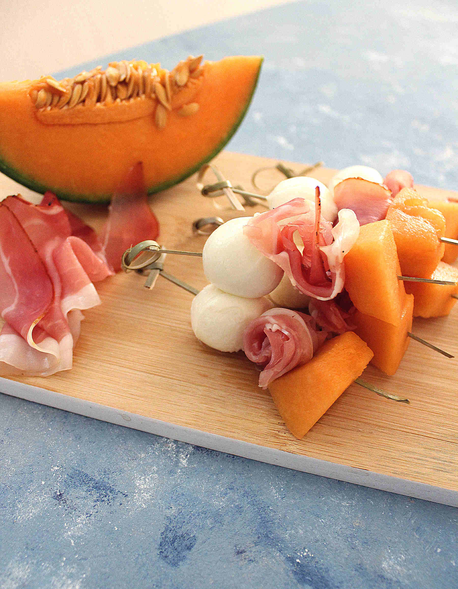 Summer skewers : mozzarella, prosciutto and melon (10 skewers) :