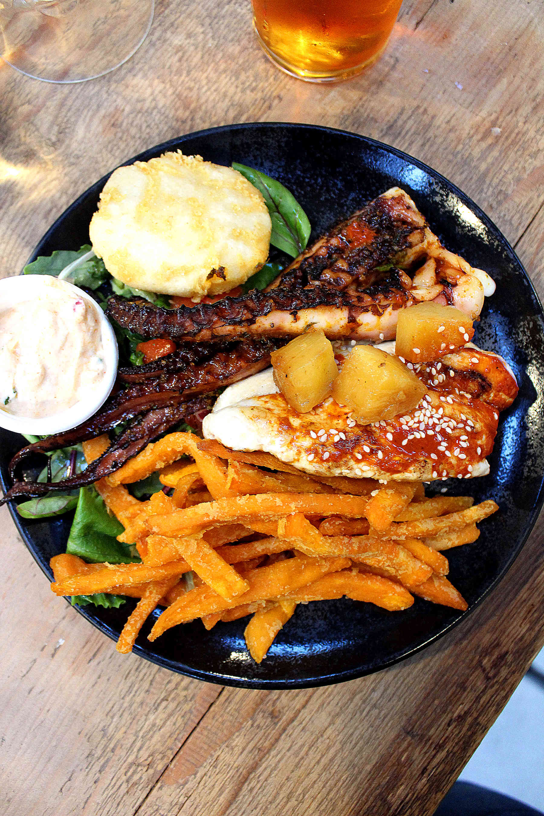 The surf&turf was my favorite. Chicken with pineapple, I love it! And octopus, can’t resist it either. Everything is well seasoned and tasty. The sweet potato fries are delicious. And we got an extra arepa because I never tried it and it was great to taste it there.