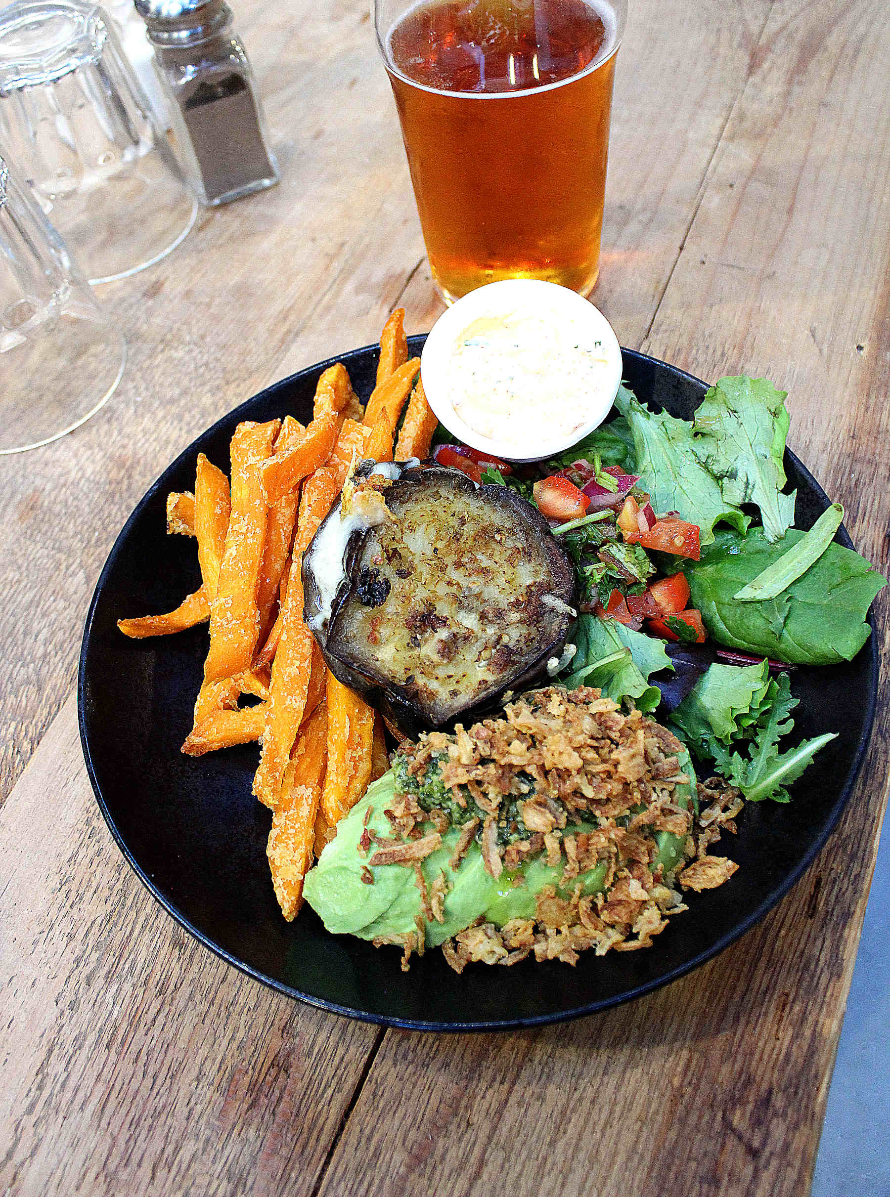 The veggie plate was pretty generous with a garlicky chimichurri, 2 slices of eggplants sandwiched together with a little bit of cheese melting in the middle, some salad, the pico de gallo sauce and some sweet potato fries. I love it. Ask it without the sour cream sauce + without cheese and you got yourself a vegan option.
