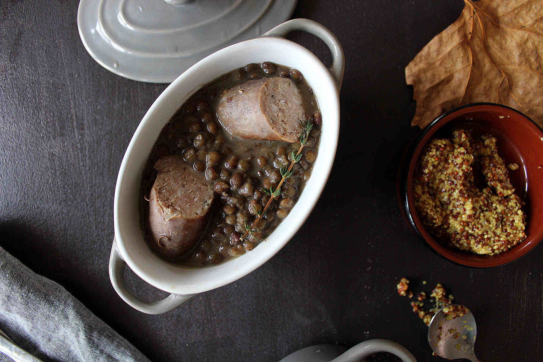 I added a little bit of thyme to give it even more flavors, you could also throw a bay leaf in there. And if you fancy smoked sausages, you can definitely use that too. I did in the past and it was as delicious! Wholegrain mustard is a must for me, serve some on the side and enjoy with the lentils… Typical french I know.