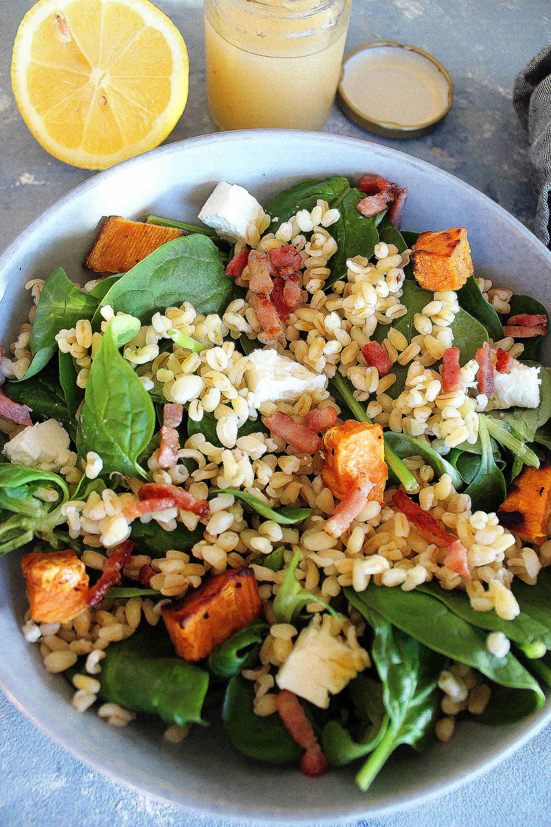 To assemble, put a handful of lamb’s lettuce and spinach in a plate. Top with wheat, feta cheese, roasted sweet potatoes and bacon bits.
