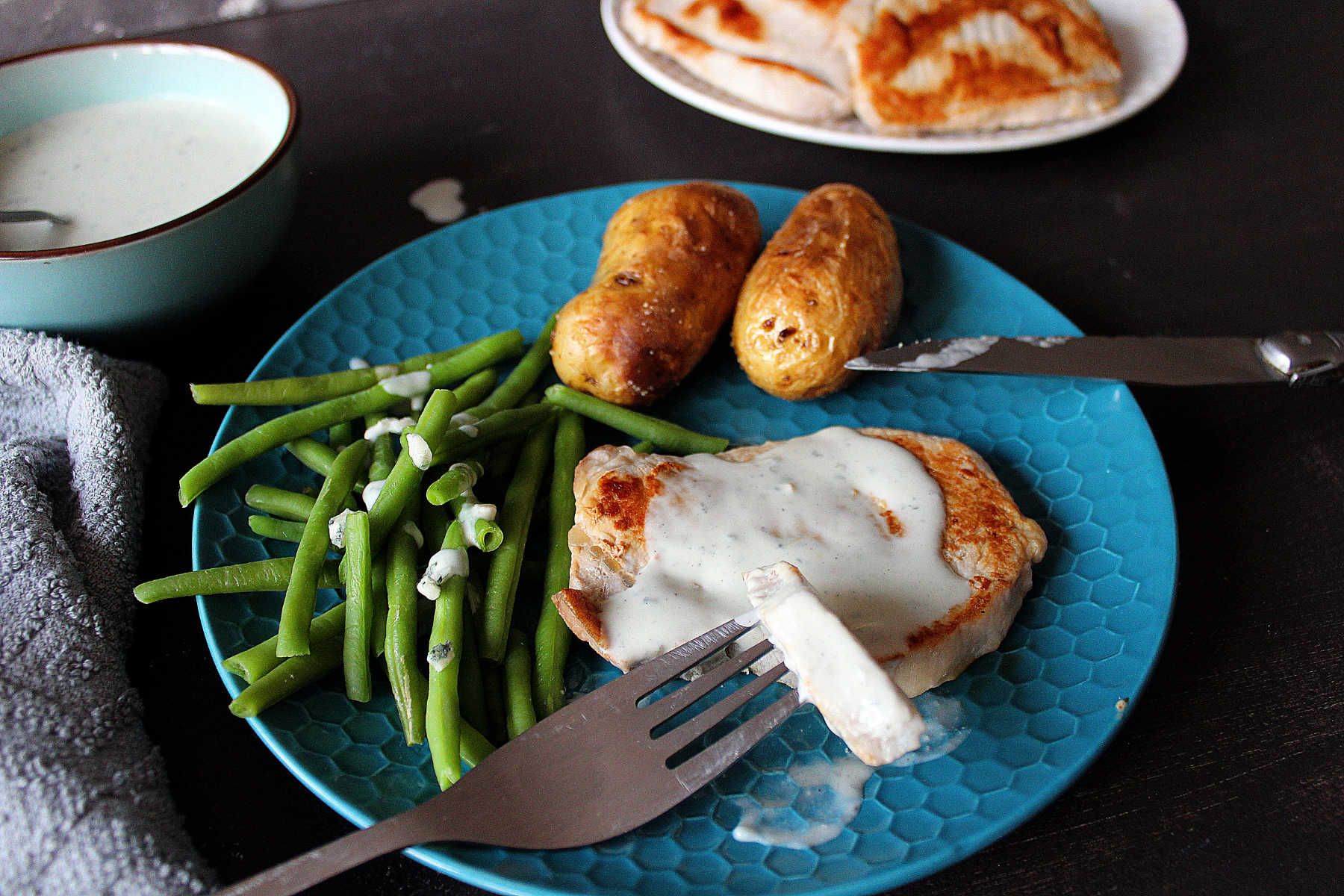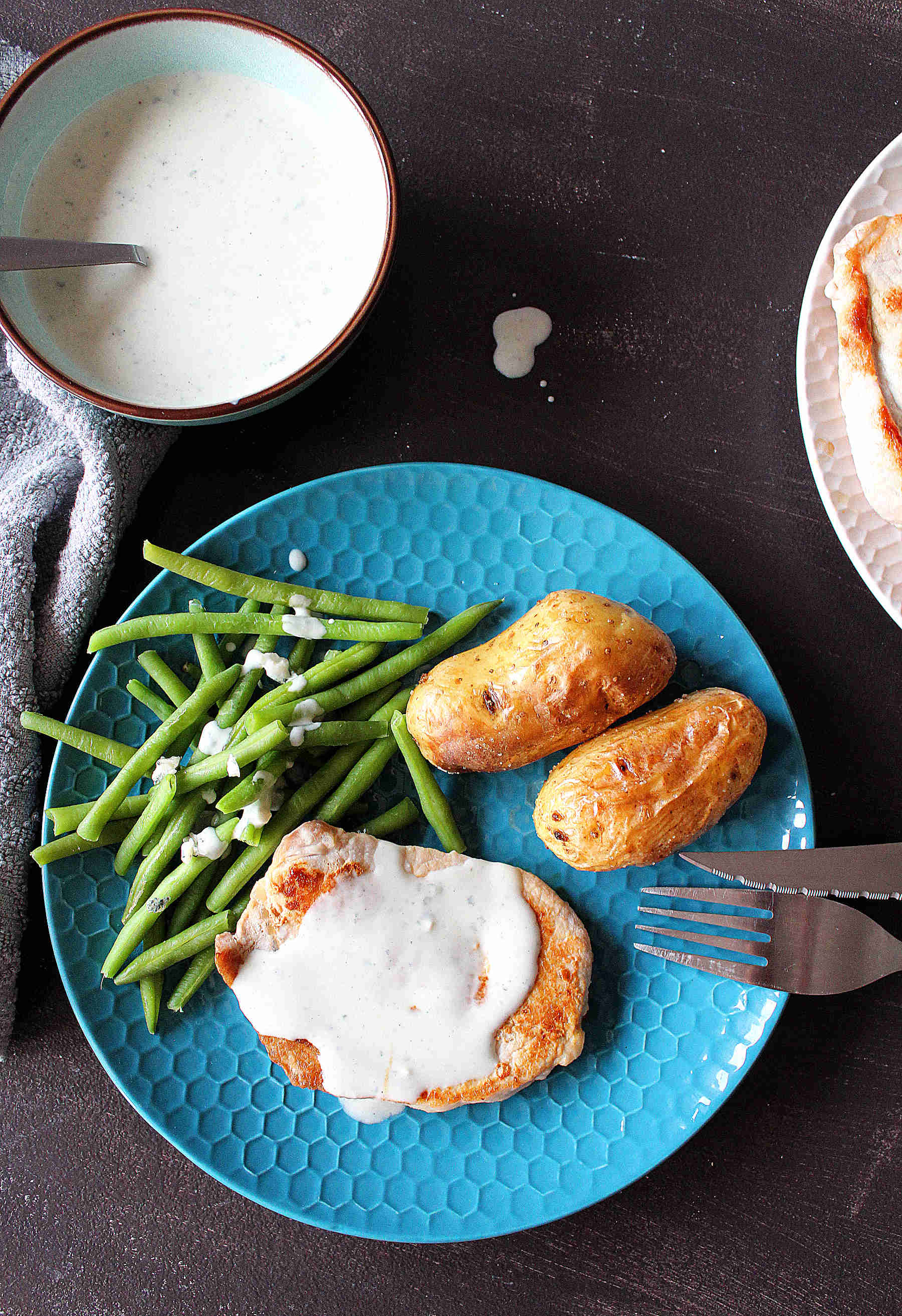 Because you can not decently spend your winter eating swiss cheese fondue, here is another idea to incorporate cheese to your diet with a healthy-ish recipe. Pork chops with a generous blue cheese sauce, served with some potatoes and greens and dinner is done!