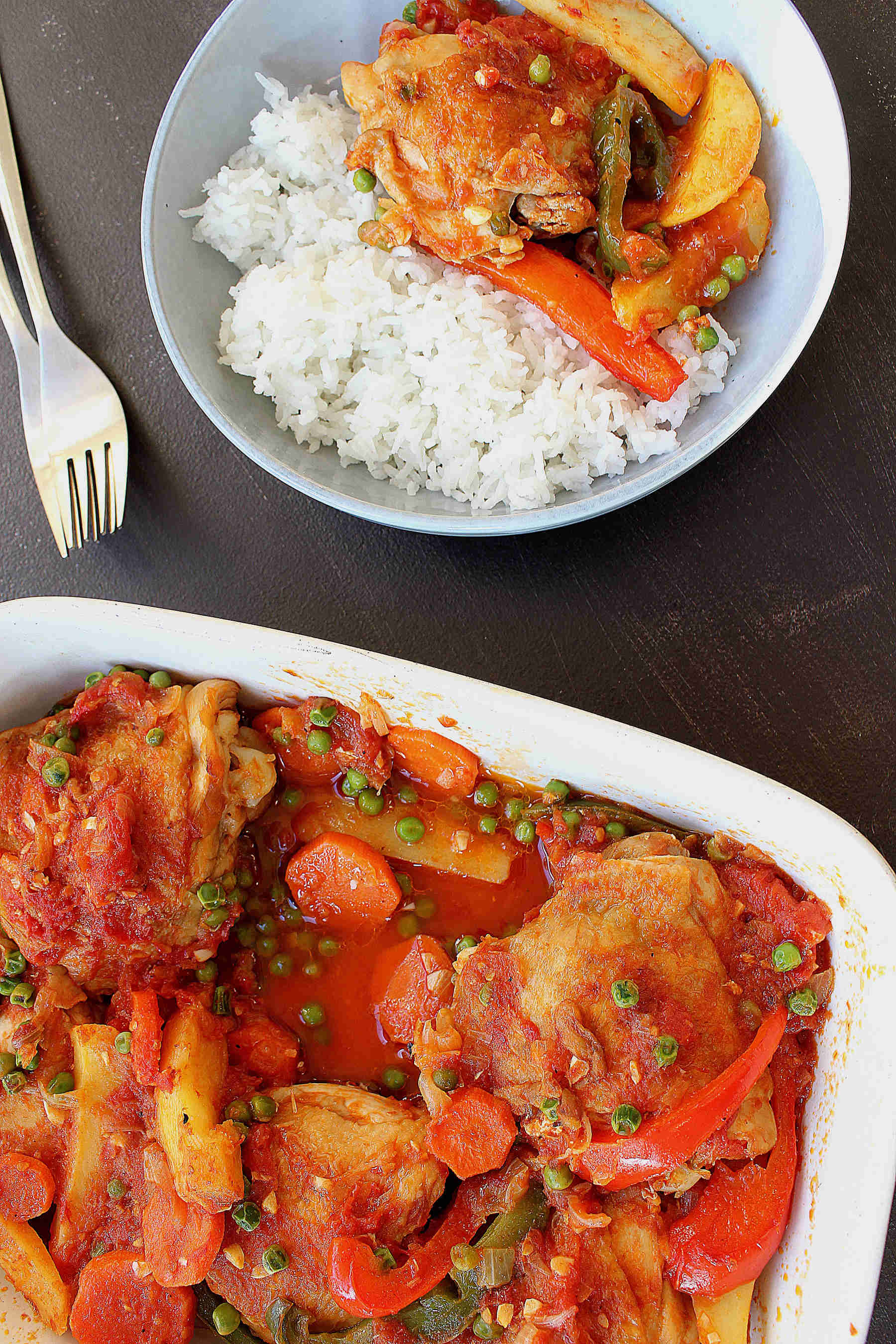 Afritada chicken is a traditional filipino dish I discovered browsing the internet to find new way to accommodate chicken. I used this recipe. I was thrilled with how it came out, we had a blast eating this meal. The sauce thickens and gets really tasty, vegetables keep their lovely texture and the meat is fork tender.