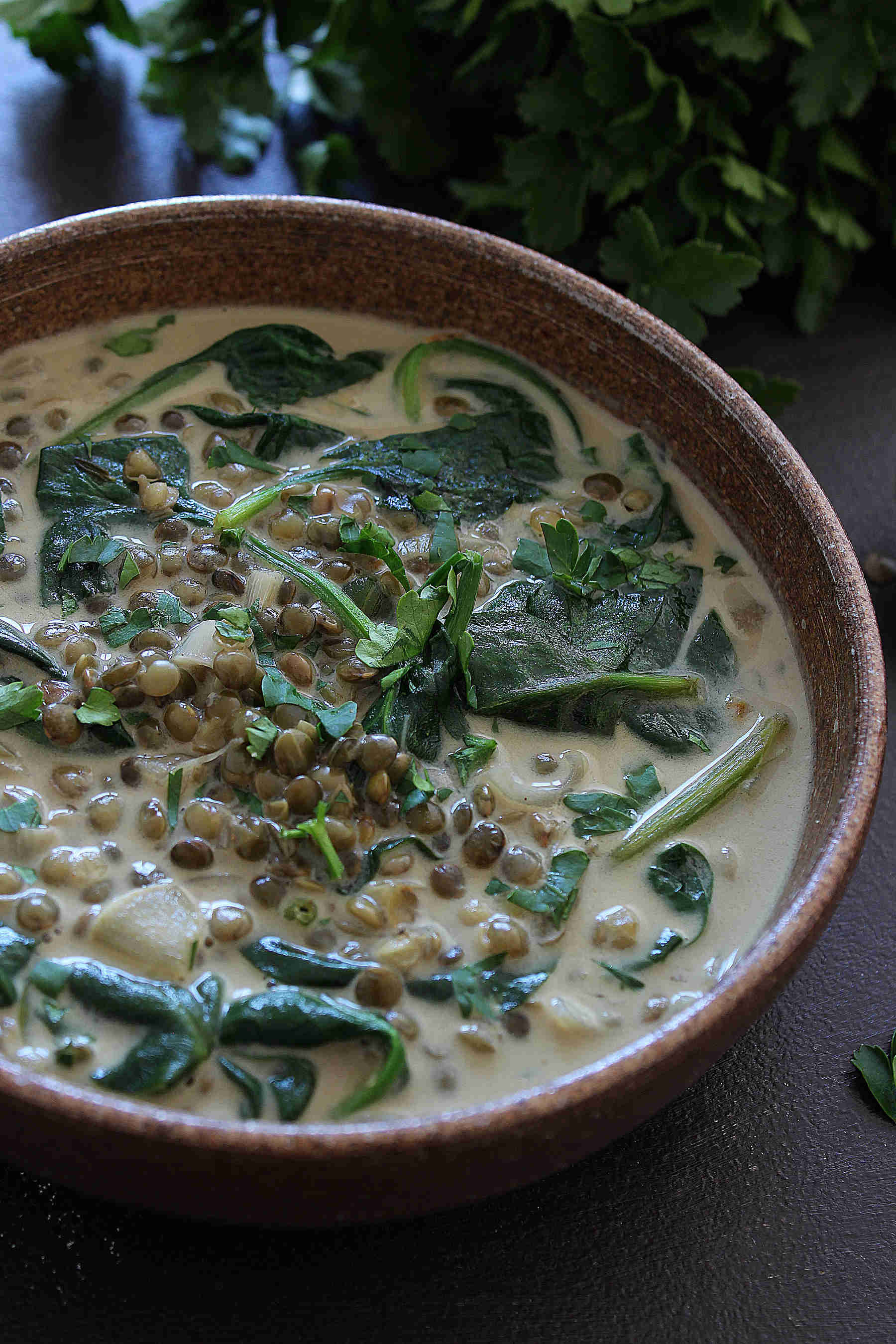 Add the onion mix into the pot of lentils. Add coconut milk and spinach. Season to taste.