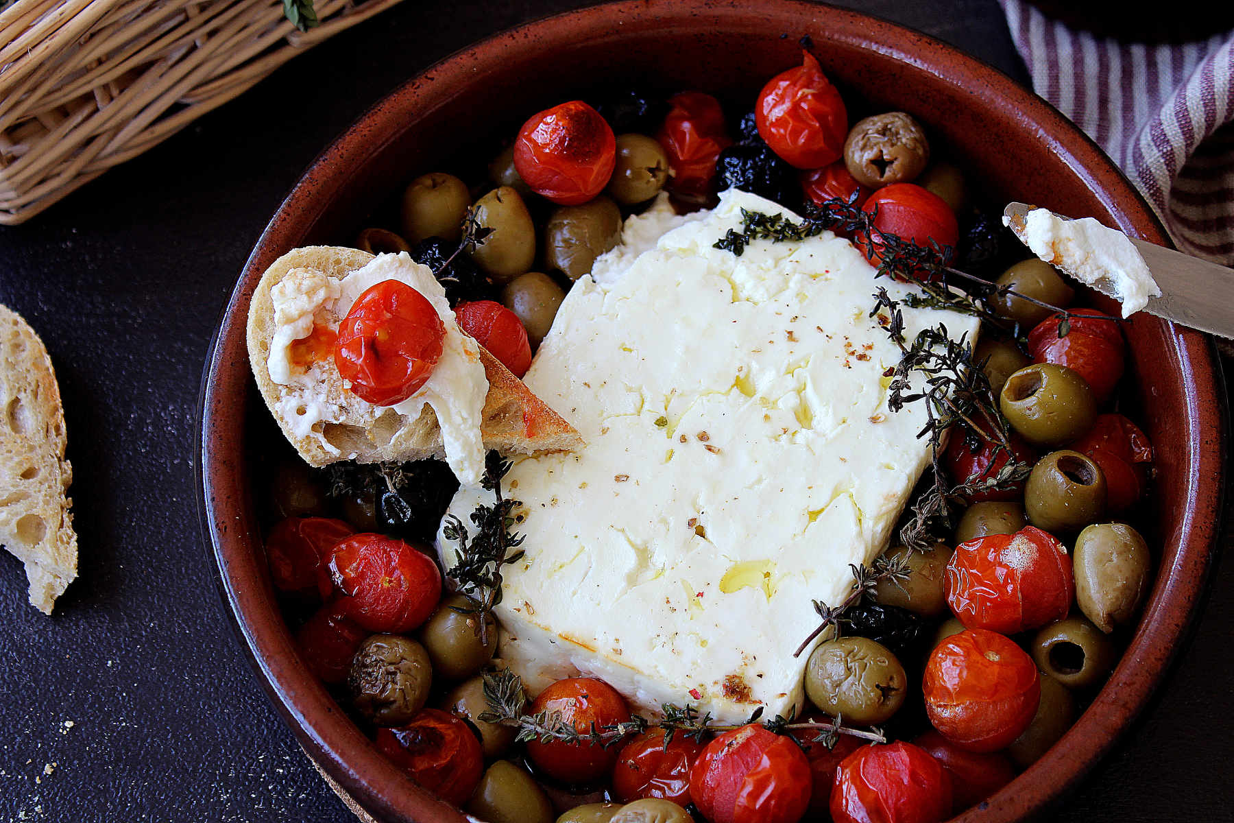 In a baking dish, add the feta. Add olives, tomatoes and thyme around it.