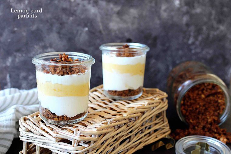 Add some yogurt then pipe a generous layer of lemon curd with the piping bag. Put yogurt on top and garnish with a little bit more granola.
