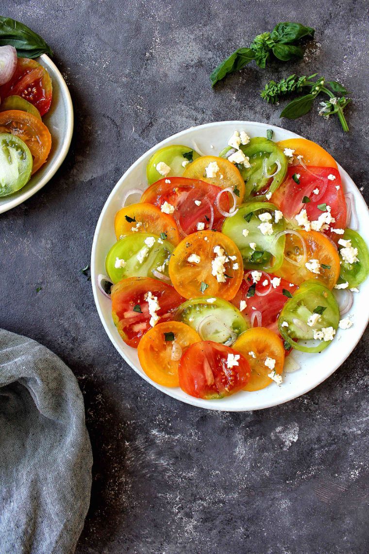 What a joy for my heart to eat such colorful tomatoes! It is as pretty as it is delicious. This salad and little bread, some grilled fish and we’re set for a summer feast. This is such a simple salad I’m just really showing off this shots I’m proud of! A nicely plated tomatoes salad.