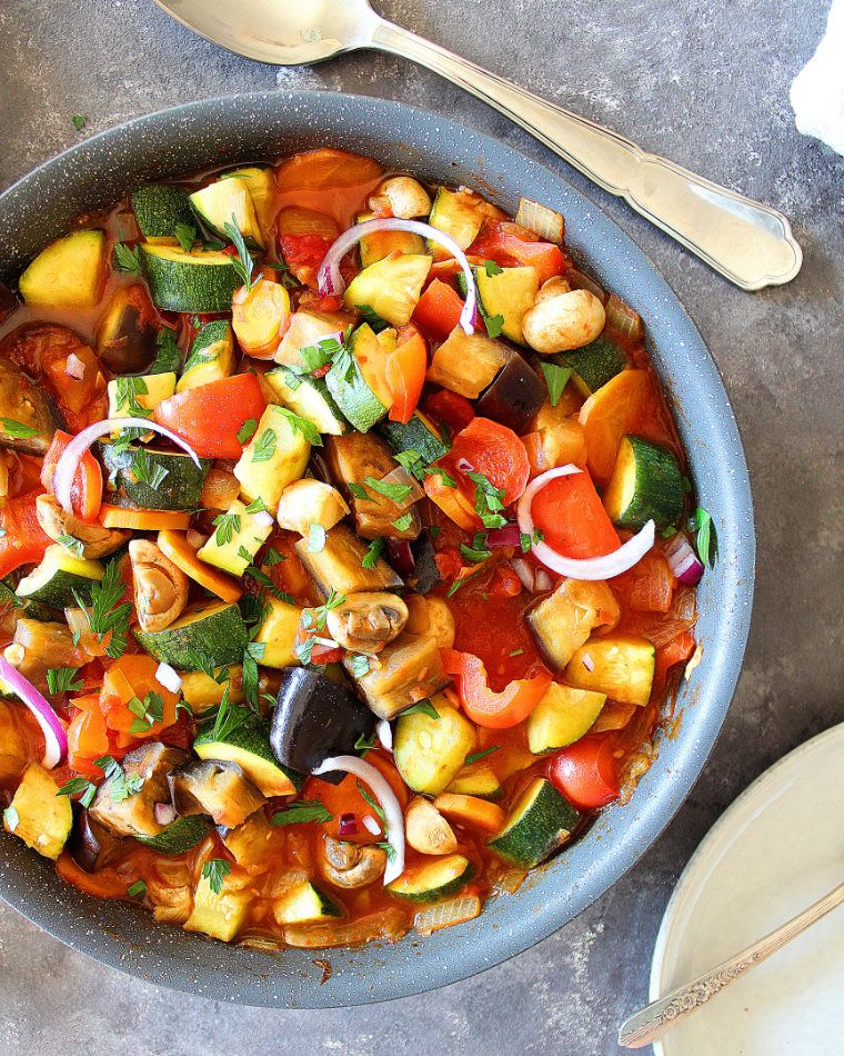 Temps have dropped a little bit, so I am back to warm meals. I like eating stews through Winter but it is also great to make it in the Summer where this is an abundance of fresh and colorful produces at the market. Zucchinis, eggplants, tomatoes... Everything is perfect for a stew!
