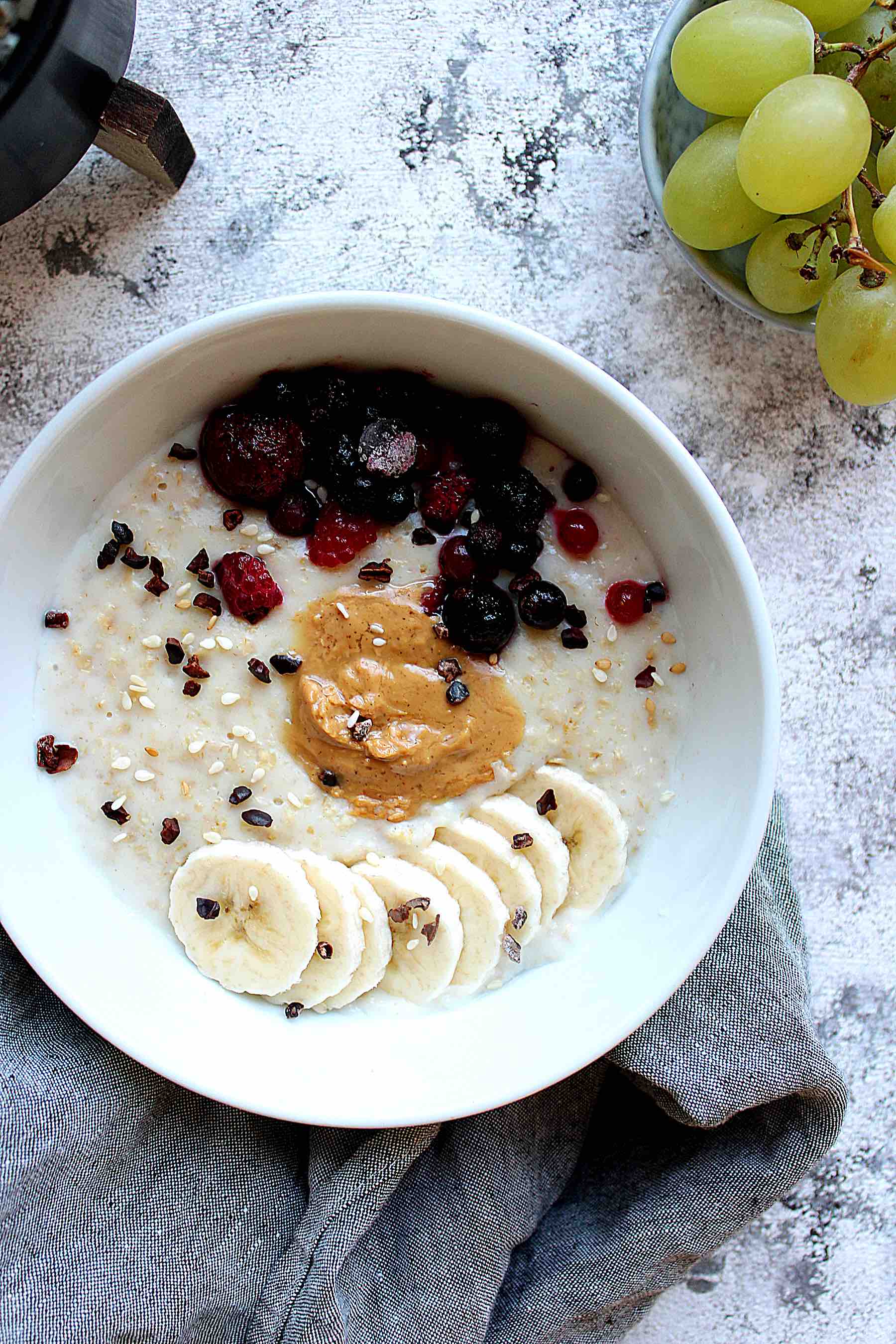 Pour the porridge into a bowl and add banana, berries and peanut butter.