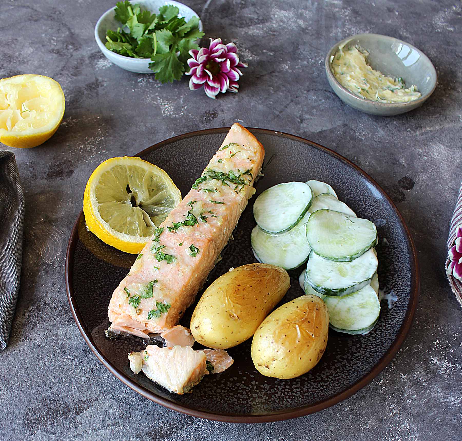You can also make big batches of the butter and store in the fridge (or freezer) for later use on other fishes or whites meats! Two potatoes, a cucumber salad and we had a blast!