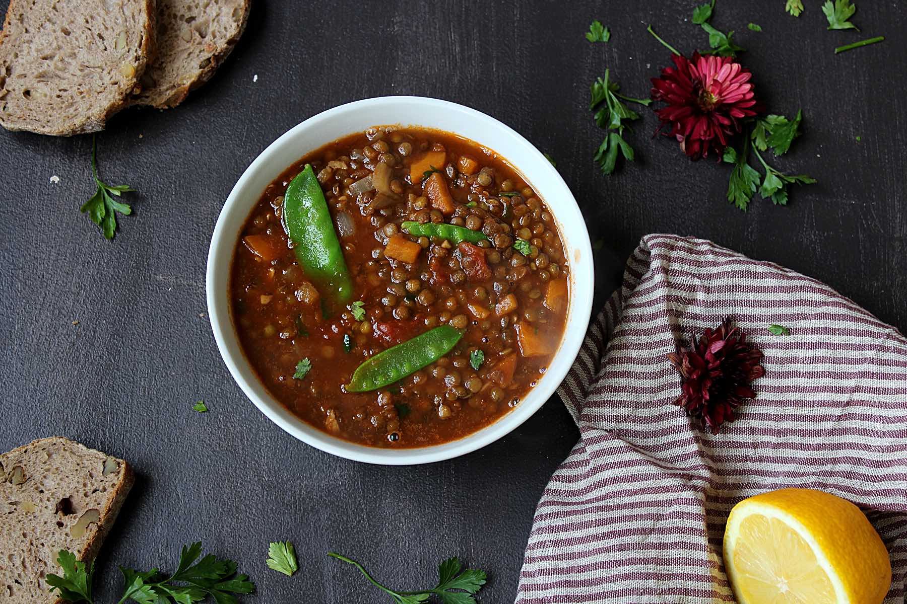 Here is a recipe that fits our gloomy and rainy weather perfectly. A delicious lentils soup with veggies and lots of spices to warm up and have fun too.