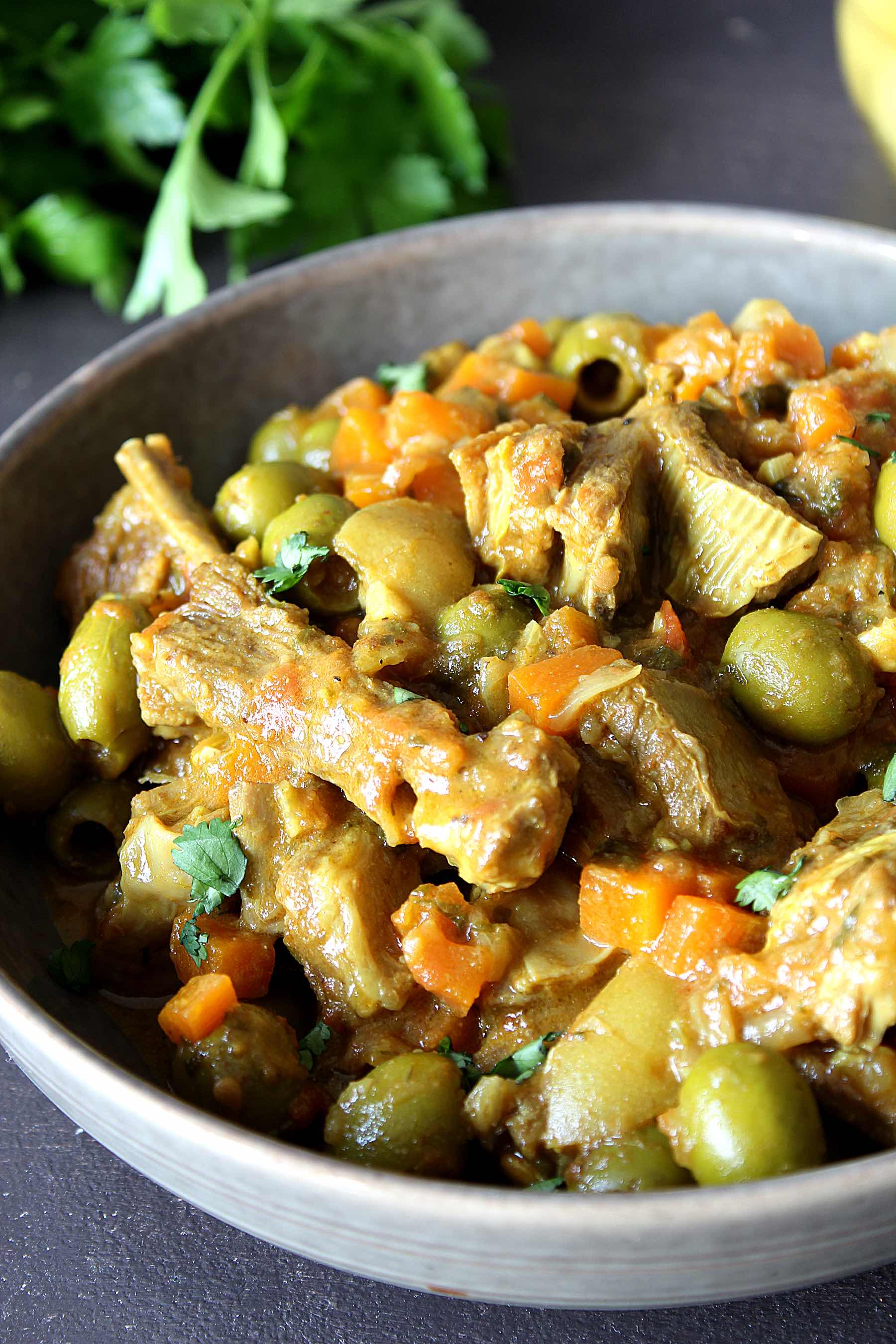 There are SO many recipes for tajines, each family basically has one. So if you don't like olives and lemon, you'll find something you like on the internet I'm sure. I stole this recipe from my sister who stole it from here moroccan mother-in-law and it is A GOOD one! Serve it with bread (or fries)!