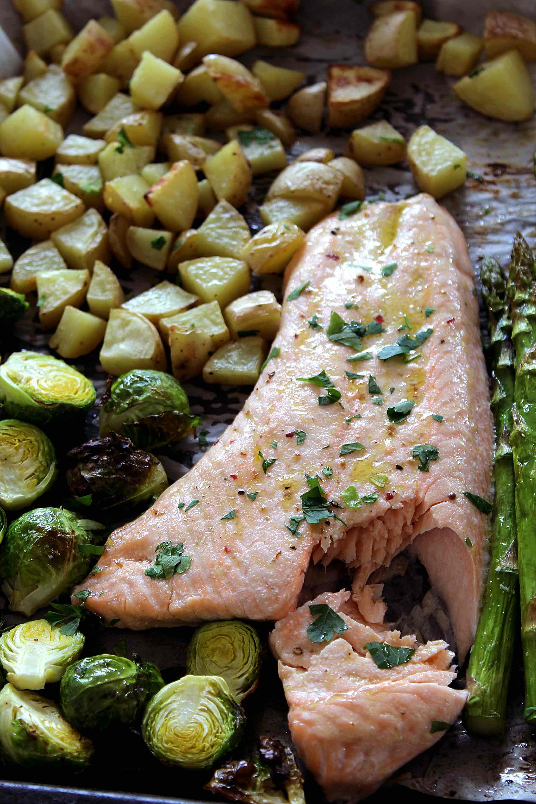 Sheet pan dinner sounds familiar to you? If not, it's just a "throw everything on a baking sheet" and have dinner ready kinda thing! Magic. Mine is pretty balanced I'd say we got carbs (potatoes), protein (salmon) and 2 kinds of veggies (asparagus and brussels sprouts) because my household is divided. I'm the only one rooting for brussels sprouts!