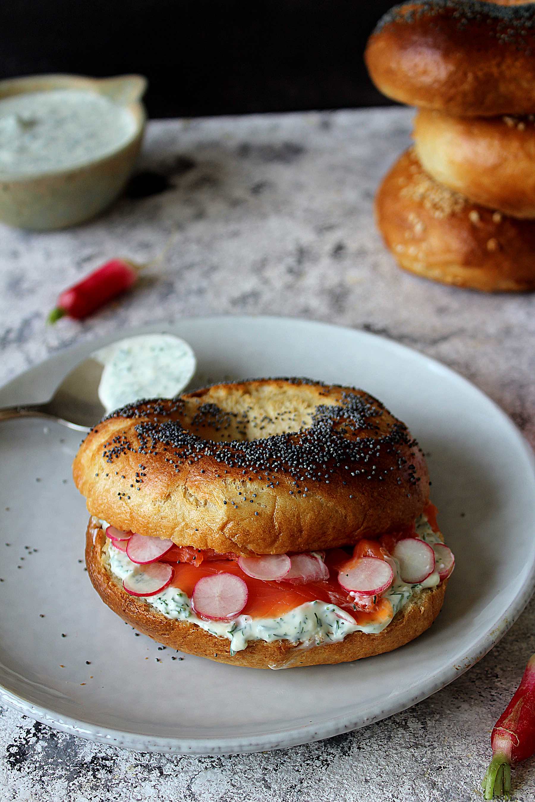 Let's talk about the dill cream for a second because it is soooo good. It's easy to make and quick too. You have to let it rest a bit in the fridge though, so it gets a chance to thicken. If you don't it will be very runny and messy in the bagels. You can replace the smoked trout with salmon or even meat if fish isn't your thing!