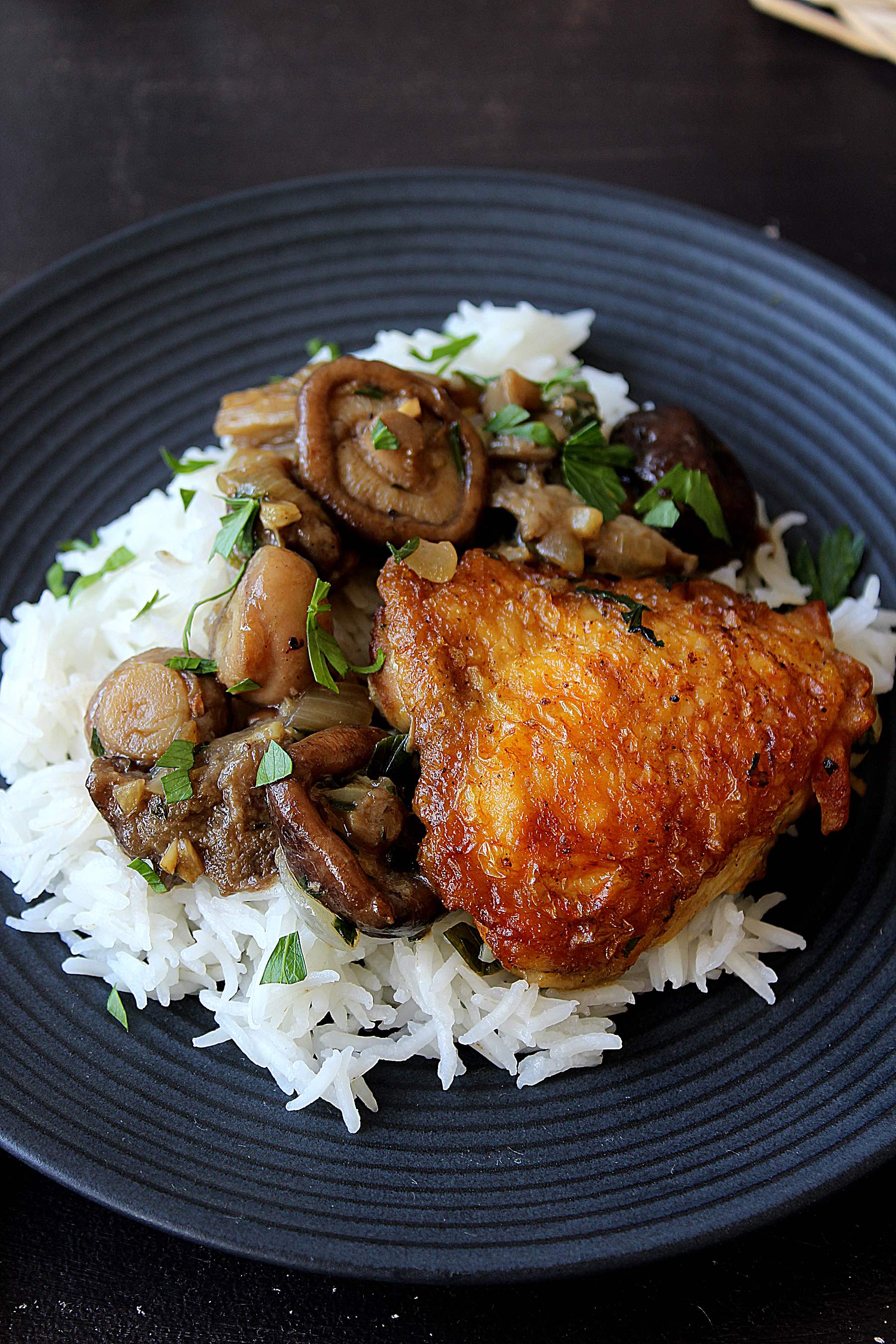I used a ready-made wild mushroom mix with lots of different types of mushrooms but use what you got on hand it's fine! Serve it on a fluffy bed of basmati rice, pure bliss, no kidding. I added even more parsley on my plate because I love ittt.