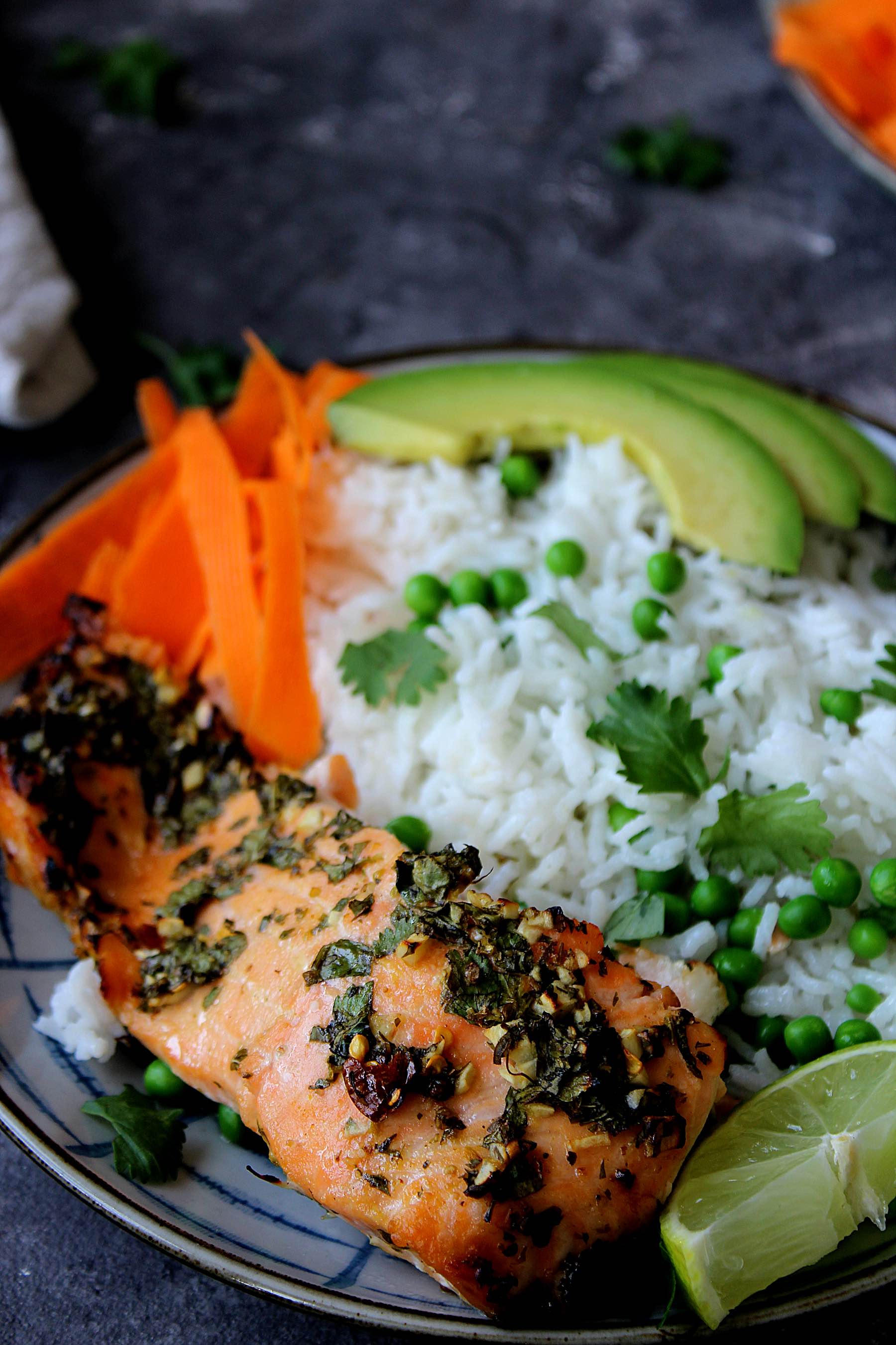 Fairly quick to make if you think ahead to let it marinate. Perfect for a lunch at home or light dinner. I also like adding broccoli or sprouted lentils to this! But seriously, this salmon and this sauce... Mindblowingly spicy and delicious. Tone the chilies down if you don't like it too spicy.