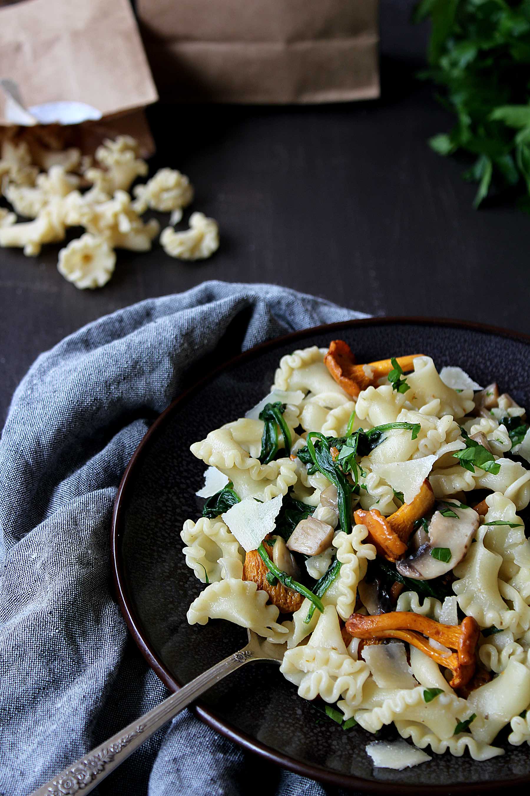 Here is a beautiful Fall recipe that will make your mouth water! So easy but so hearty and delicious : fresh Campanelle pasta, mushrooms, spinach and more! Don't tell me you don't want to bite into this, I know you'd be lying. It's vegetarian and takes no more than 15 minutes to make.