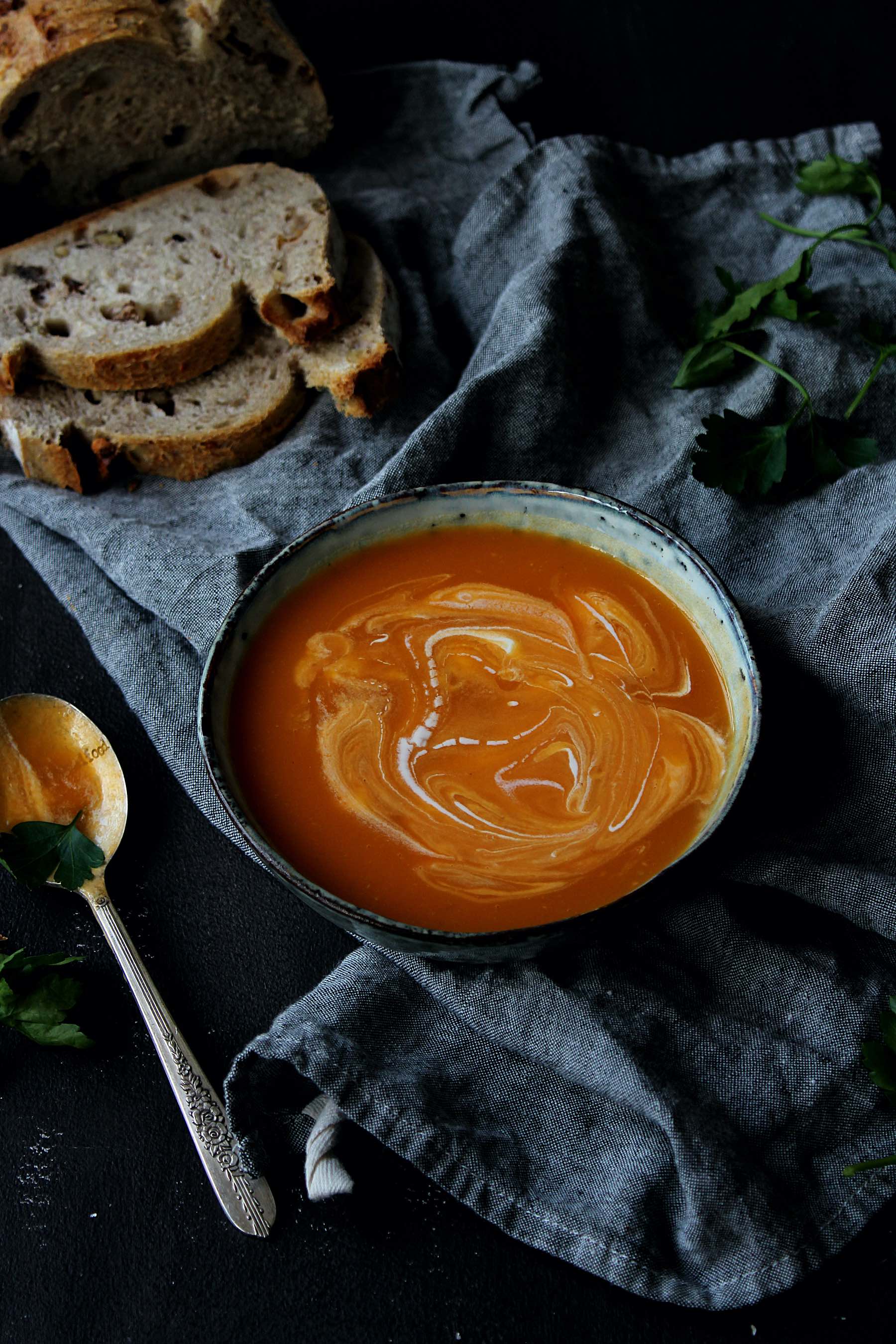 Pumpkin is a staple winter ingredient. Roasted, on salad, in soups, in baked dishes... 1001 ways to use it. Here's a very quick and easy one. A soup with only 5 ingredients that is tasty and creamy. I didn't count salt, pepper and water as ingredients, so I cheated a little bit I guess. See down below for some ideas to make it fancier!