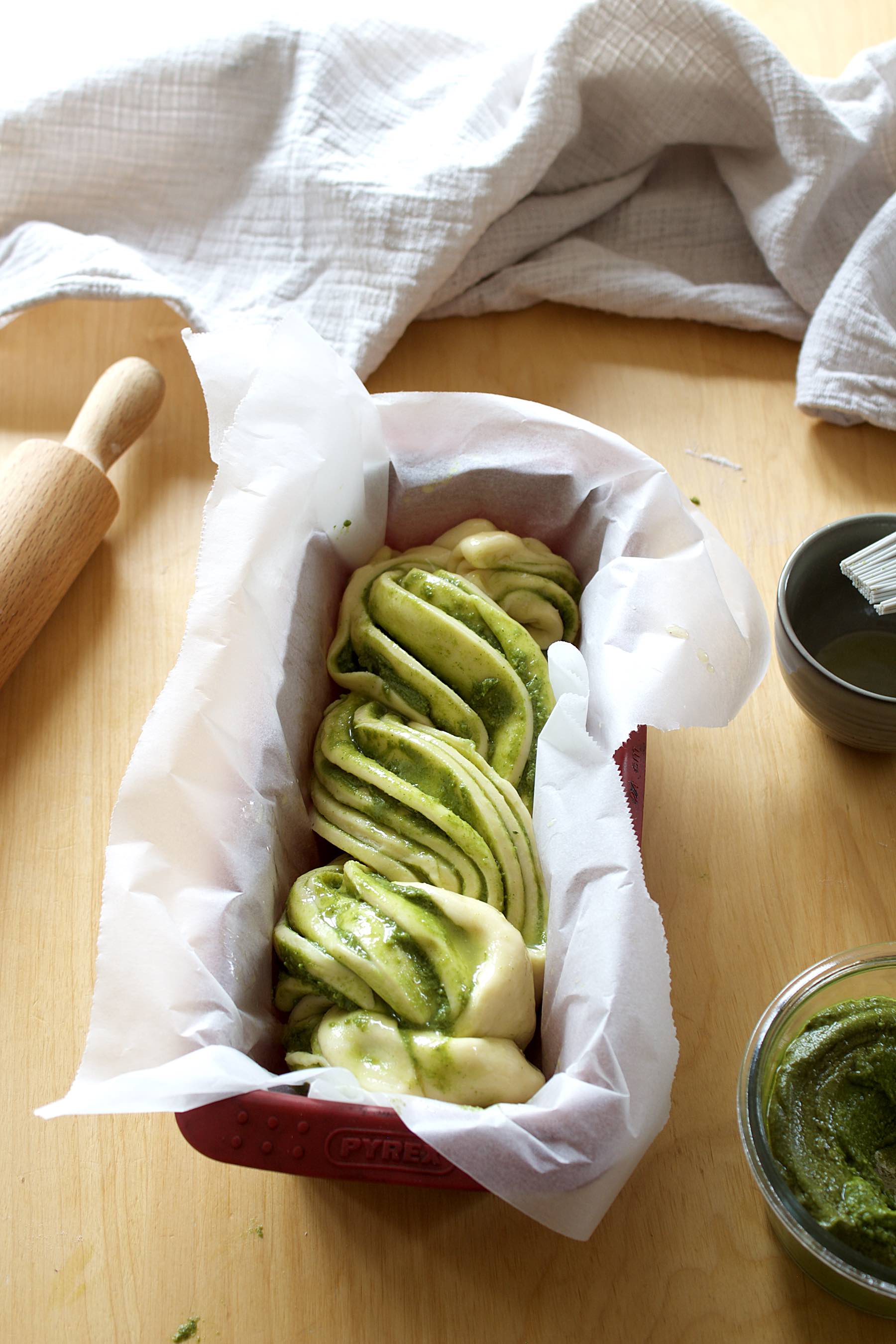 For the pesto, I made it creamier and less oily than usual because I wanted it to stick to the dough while cooking and it worked pretty well! Look at this pretty marbling.
