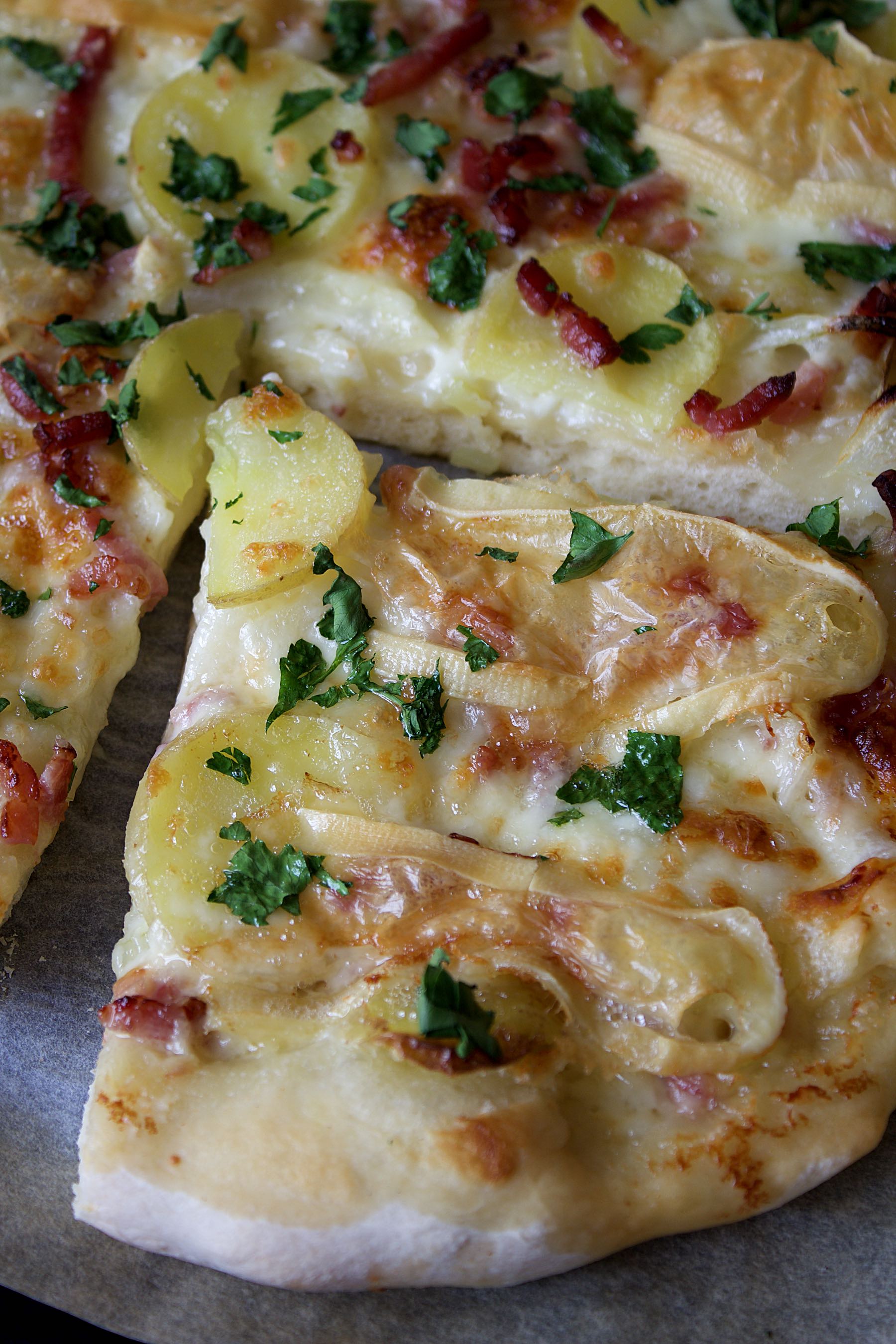 We're big fans of pizza around here, we eat it quite often. This is my daughter 's favorite toppings, she asked for it and I happily obliged. I mean, why would I not? Look at that cheese. Reblochon is a french cheese, we'd usually put it in gratin but it's delicious on pizza. Bacon, potaotes, what could go wrong here?