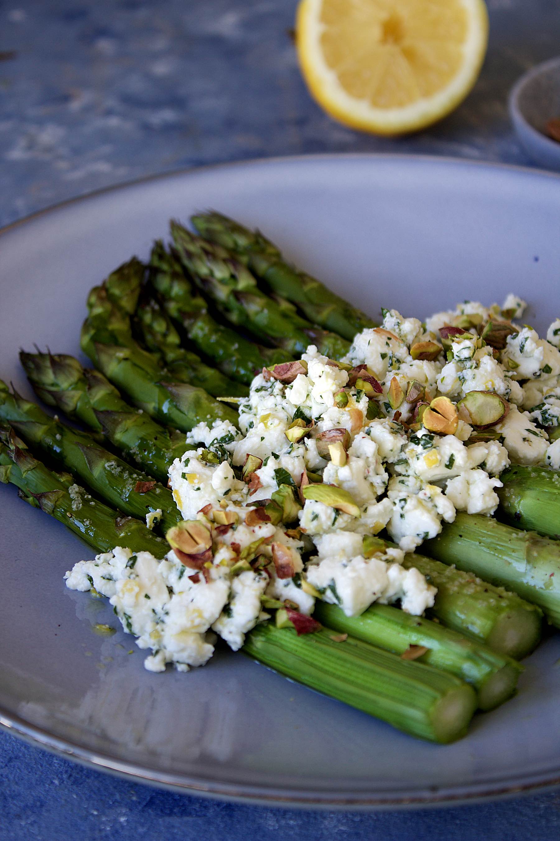 Roasted asparagus with feta, lemon and pistachio (serves 2) :