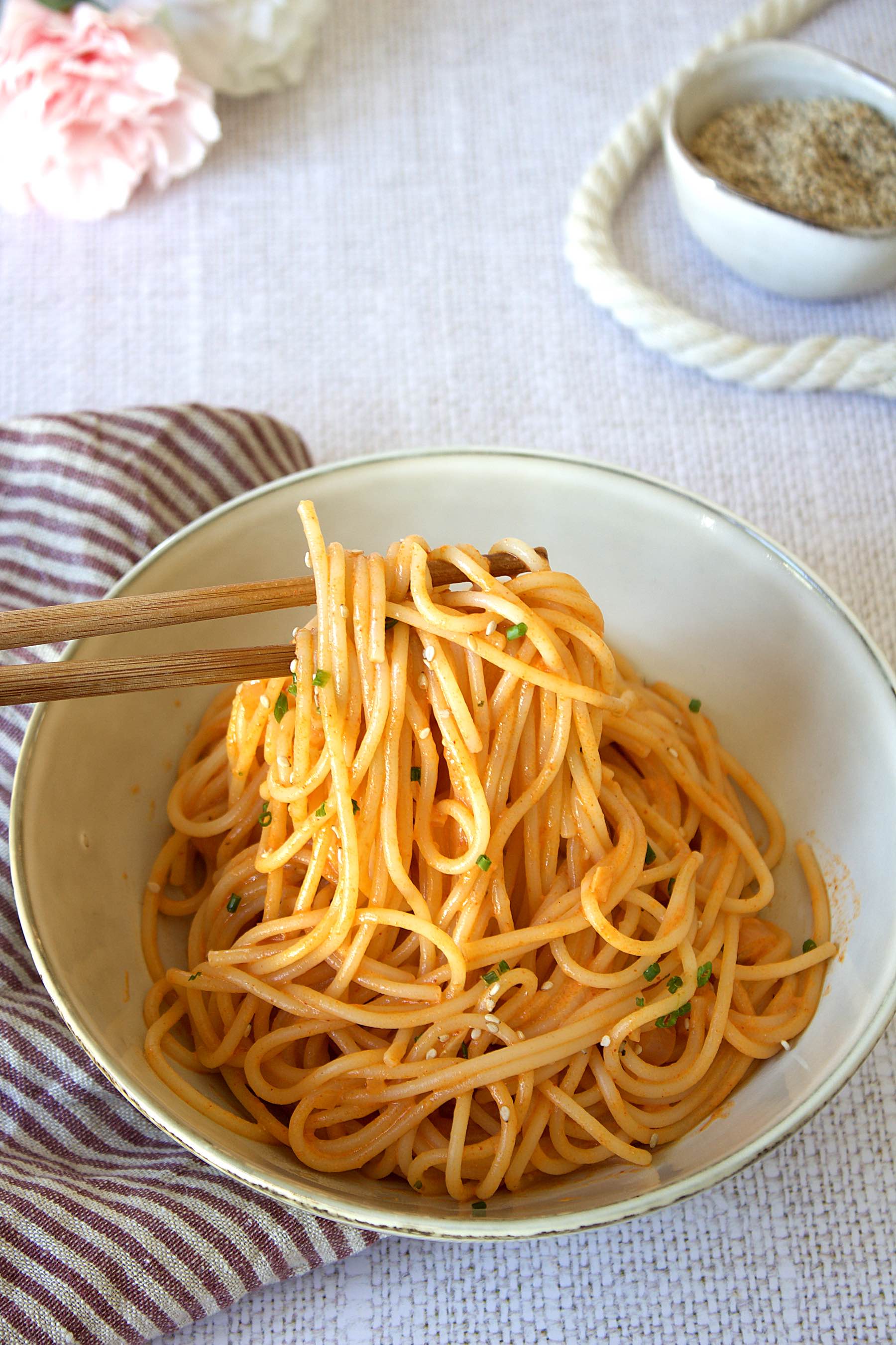 These delicious spaghetti are coated with a sour cream and gochujang (korean chili paste) sauce, they are spicy and so so satisfying to eat! It's vegetarian and can easily be made vegan too.