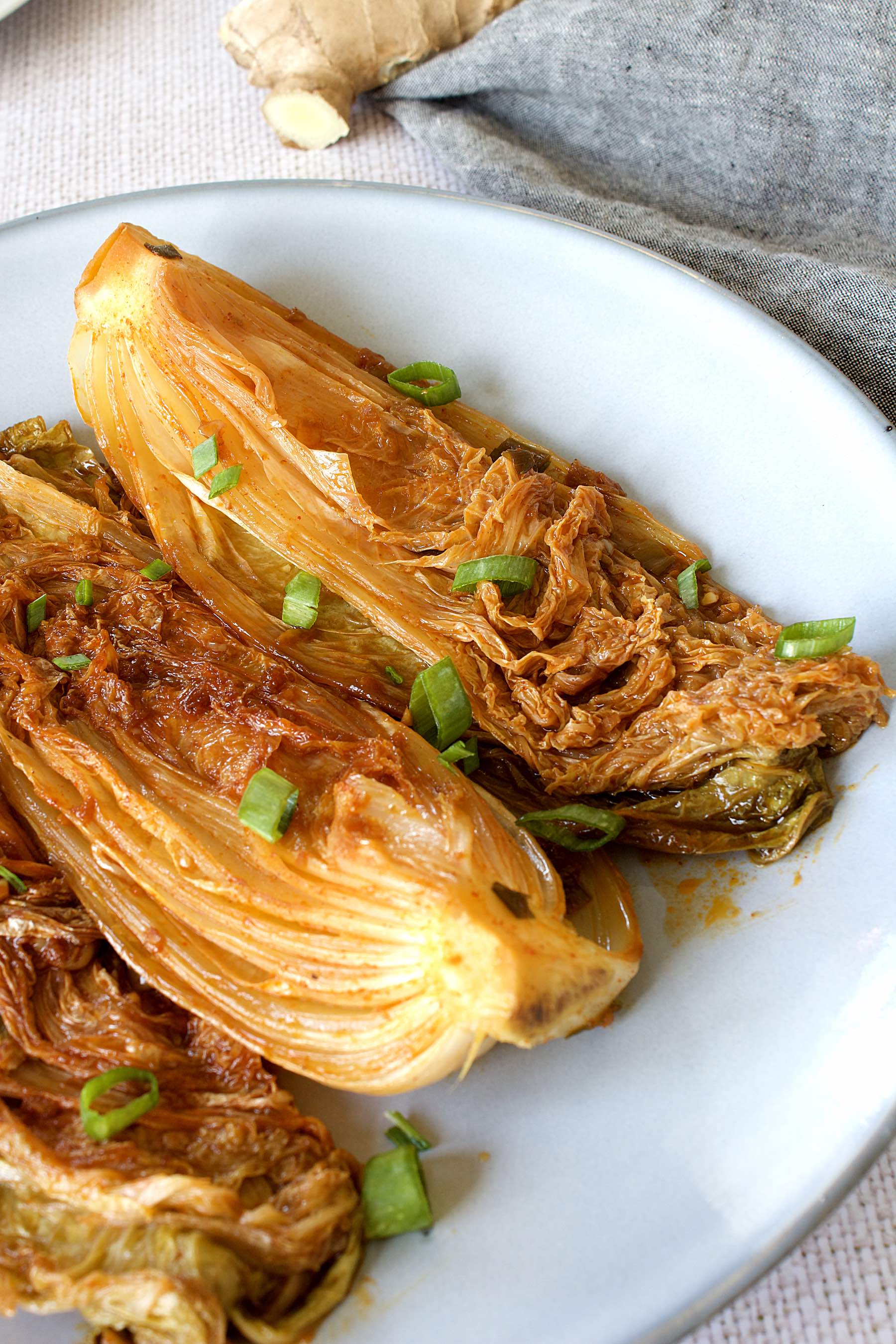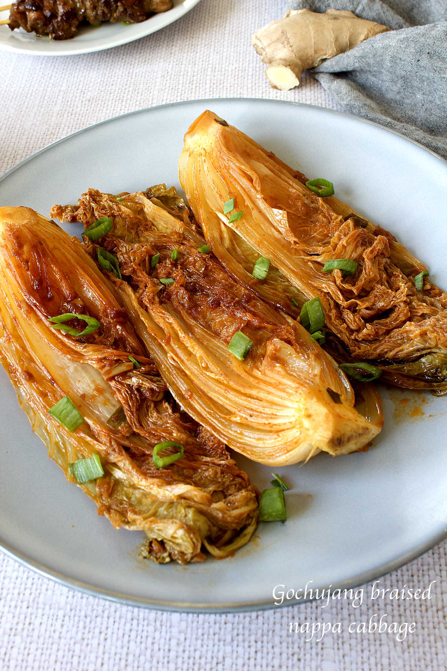 So here is a spicy side idea ! Braised nappa cabbage, marinated in gochujang and soy sauce. It's so good and is the perfect match to grilled meat and rice for example.