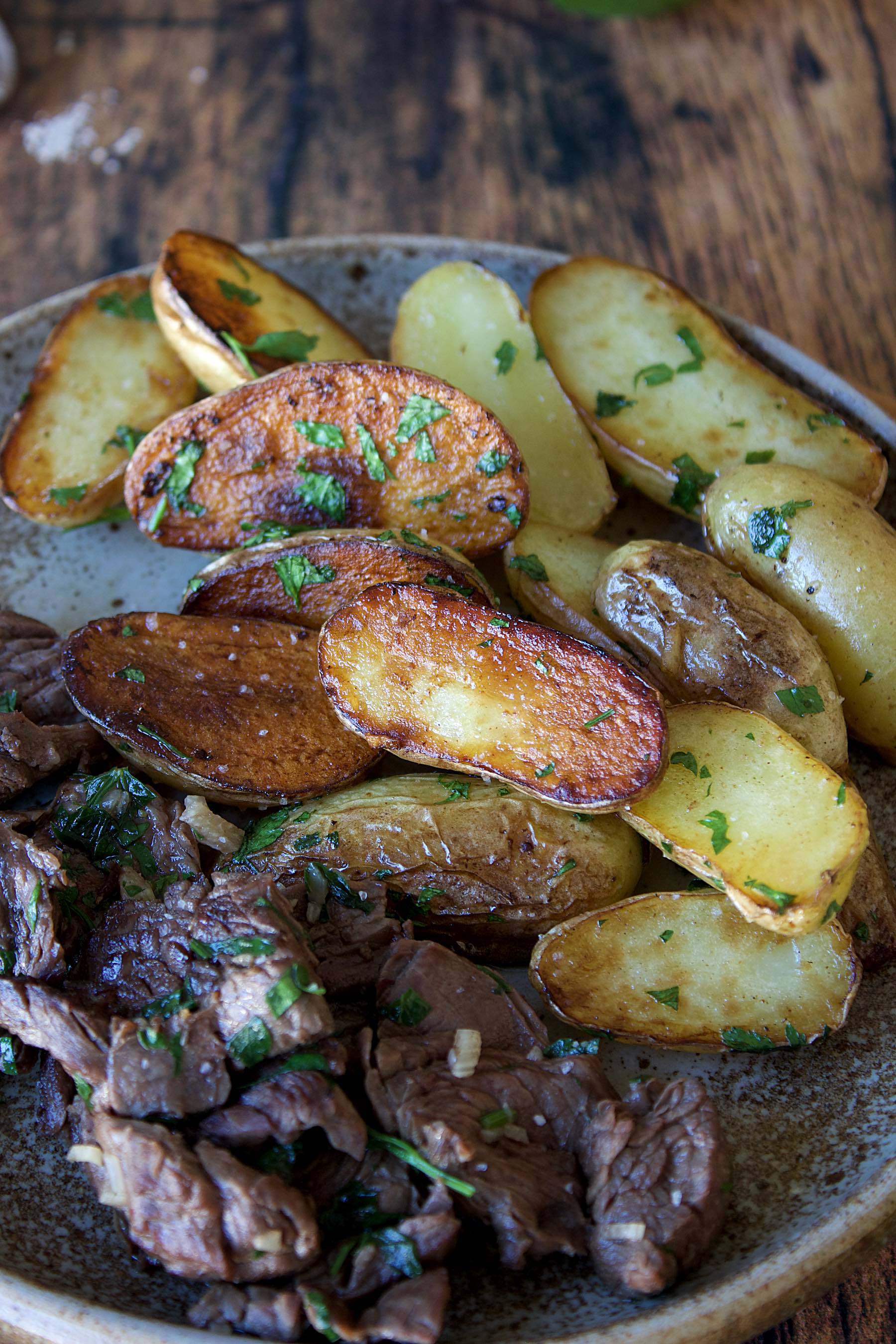 A rustic and comforting dinner like no other : seared beef with lots of garlic and crispy fingerlings potatoes. And lots of parsley !