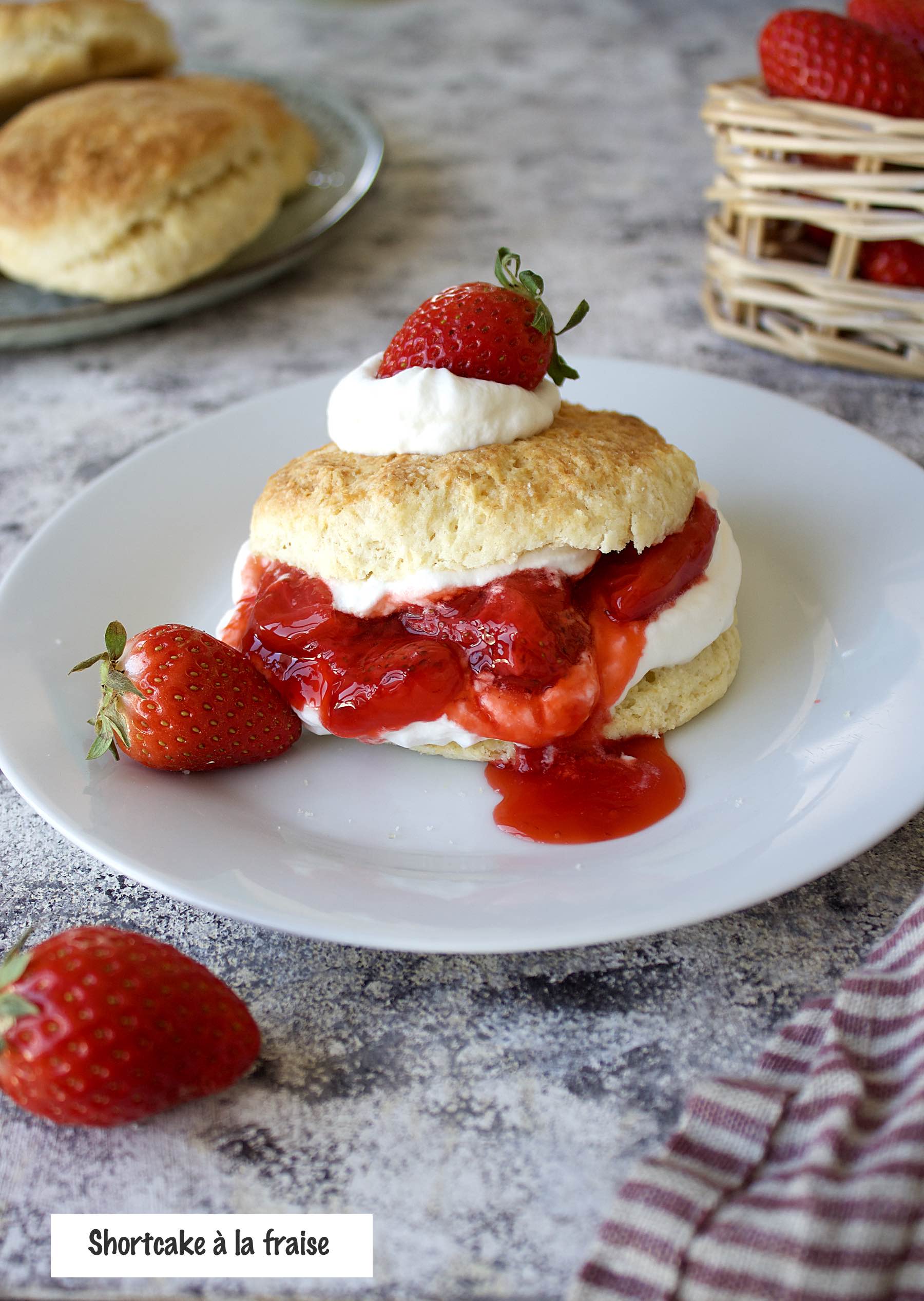 To serve : open the shortcake in half, had some whipped cream, a bit of strawberry sauce, more whipped cream. Put the top back, add a dot of whipped cream and a strawberry on top.