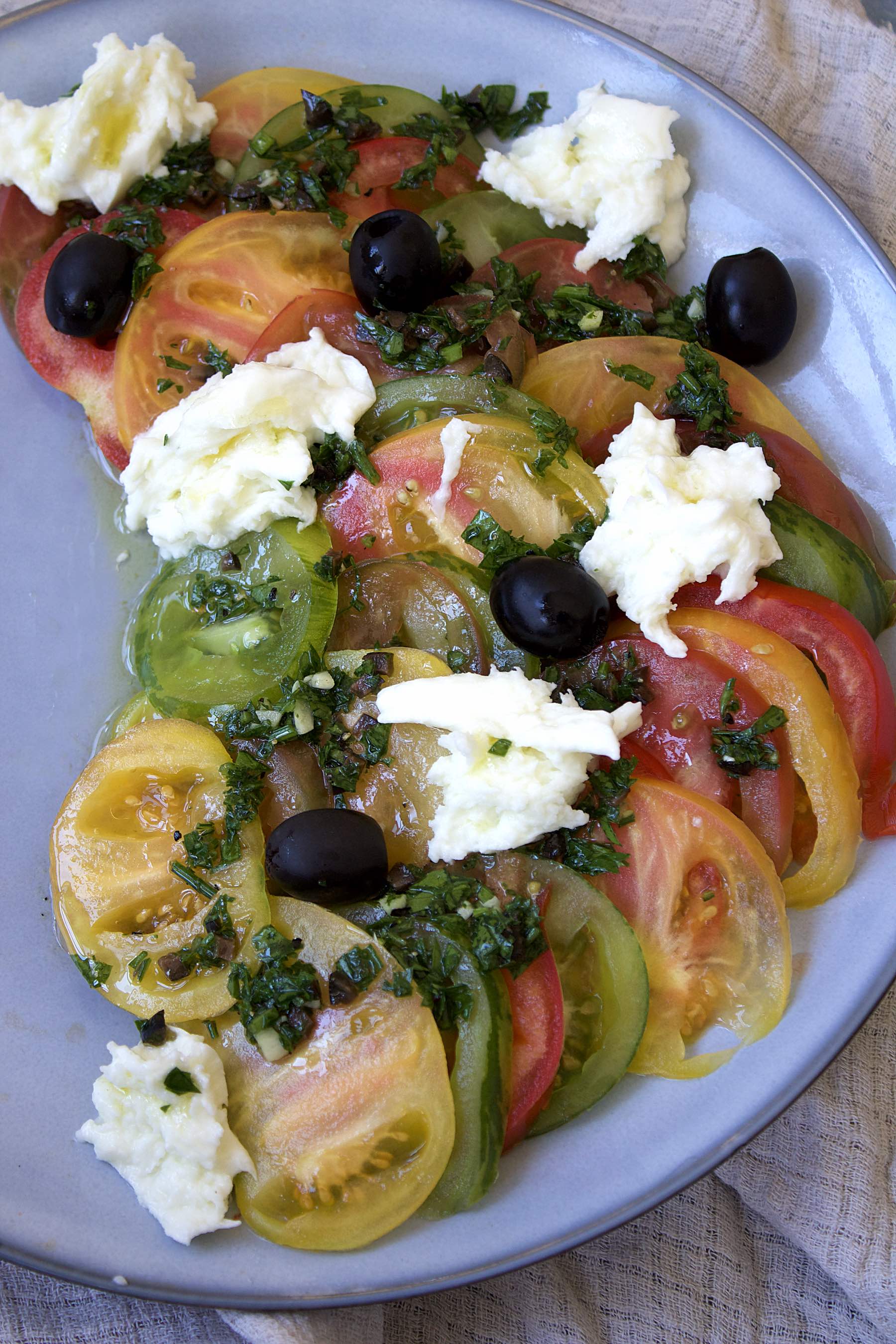 A very easy tomato salad with a black olive and parsley dressing for a nice twist. Mozzarella di buffala because it's so good and creamy ! This carpaccio was very refreshing, the perfect summer dinner.