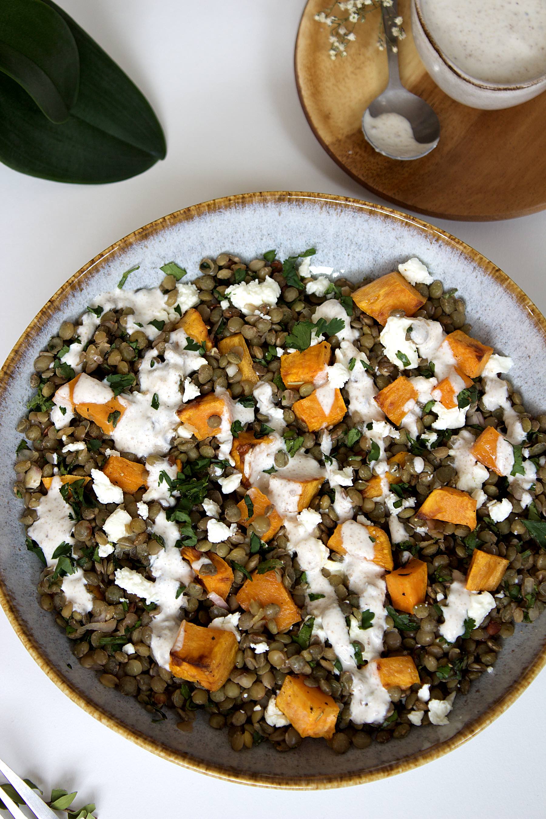 In a serving bowl, make a bed of the lentils + parsley mix. Put the sweet potatoes on top. Crumble the feta and drizzle the sauce all over.