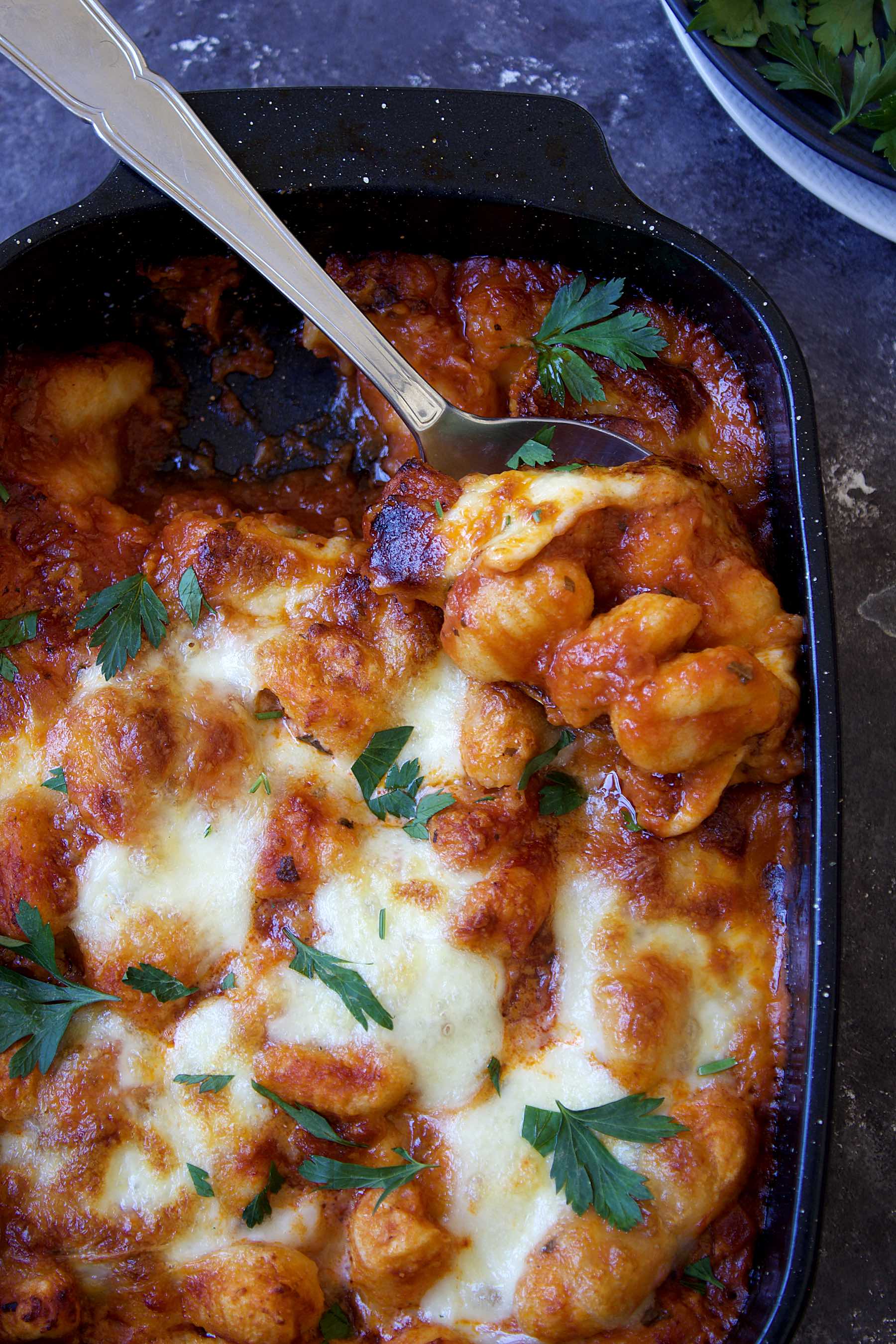 To make it even more simple (and time efficient), you can use good quality store bought tomato sauce and pour it directly in the baking dish with the boiled gnocchi, add mozzarella and bake.