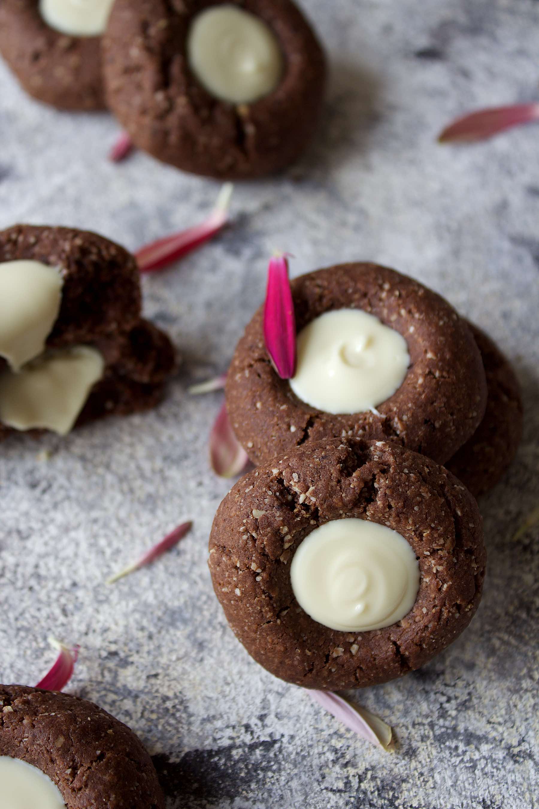 There's a lot more savory than sweet recipes on the blog, just a personal preference. Doesn't mean I don't like sweet things though, especially cookies. So I made very easy cacao thumbprint cookies, filled with sweet white chocolate. They're perfect for tea time !