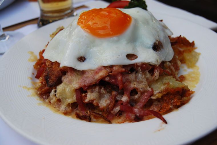 Mon mari a mangé seulement un plat, un Gemischte Rösti à 13,80CHF (11,50€ environ). C’est de la pomme de terre râpé avec du jambon, du lard, du fromage et des oignons. Il a prit l’oeuf en supplément pour 1,90CHF (1,50€). L’oeuf était visiblement un peu trop cuit mais dans l’ensemble c’était plutôt pas mal.