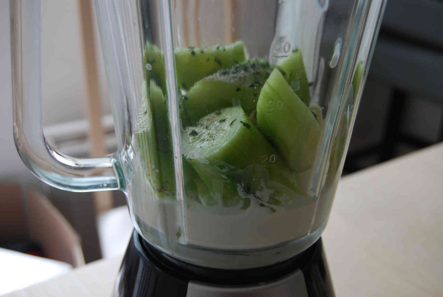 Mettre la crème liquide dans le blender, le concombre, l’ail, un peu de sel et de poivre et quelques brins de persil. Blendez. Rectifiez l’assaisonnement si nécessaire.
